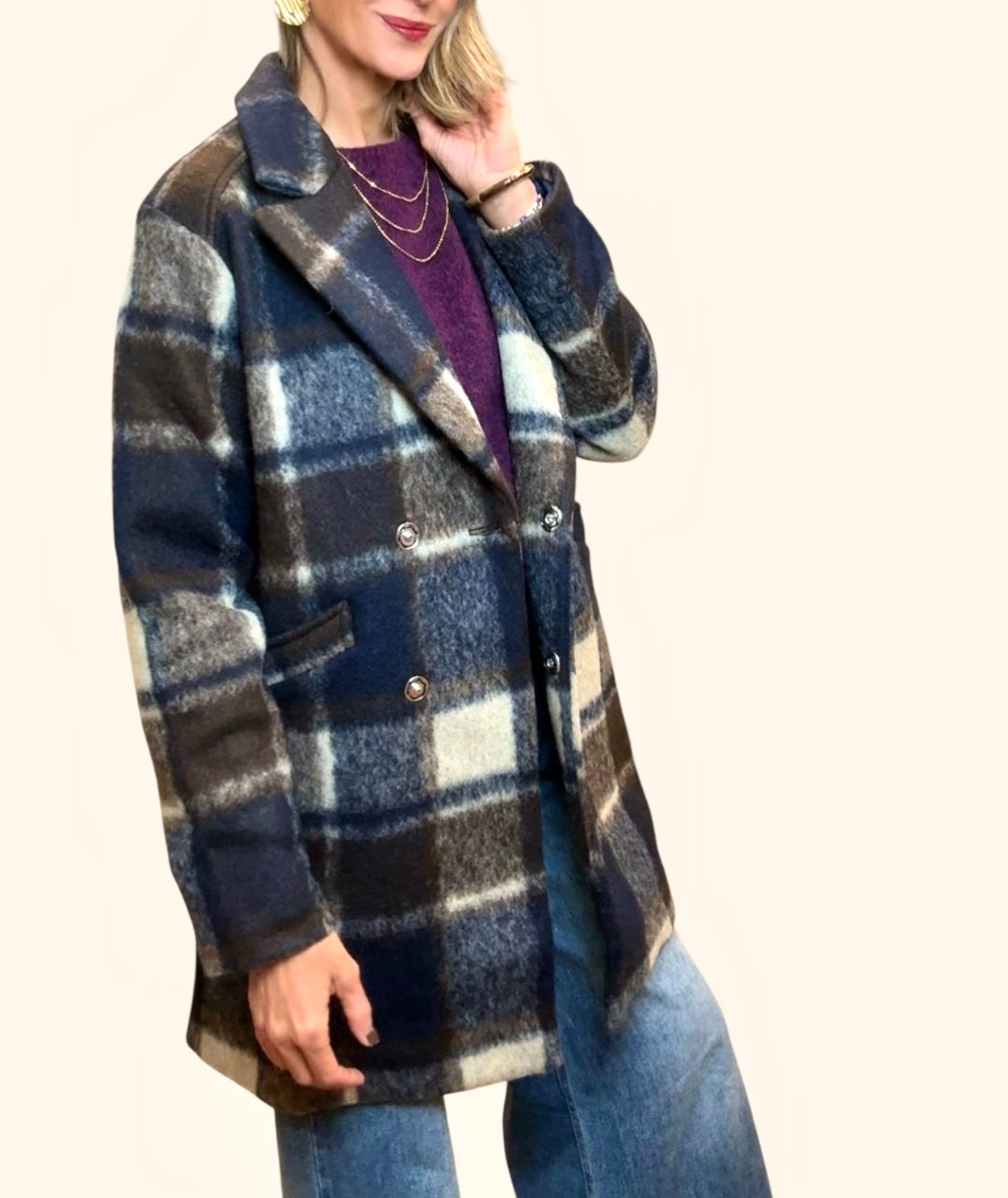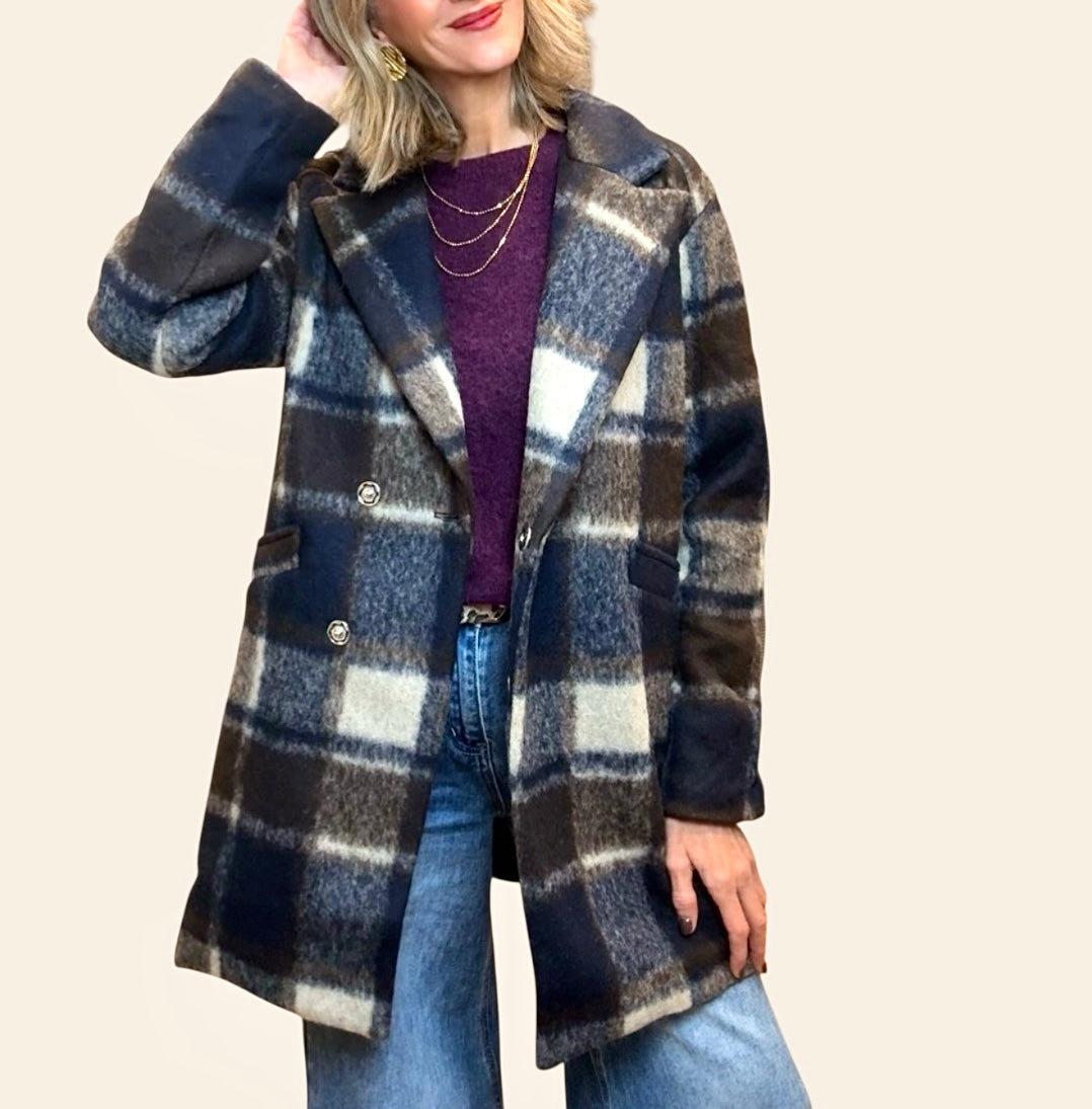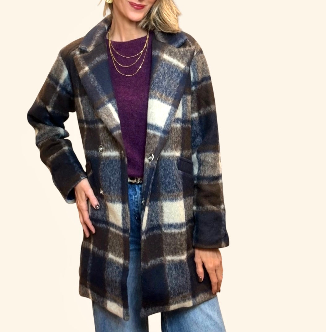 Abrigo de cuadros en colores azul marino ,marrón y beige .Cierre con botones.Bolsillos.Forro interior.