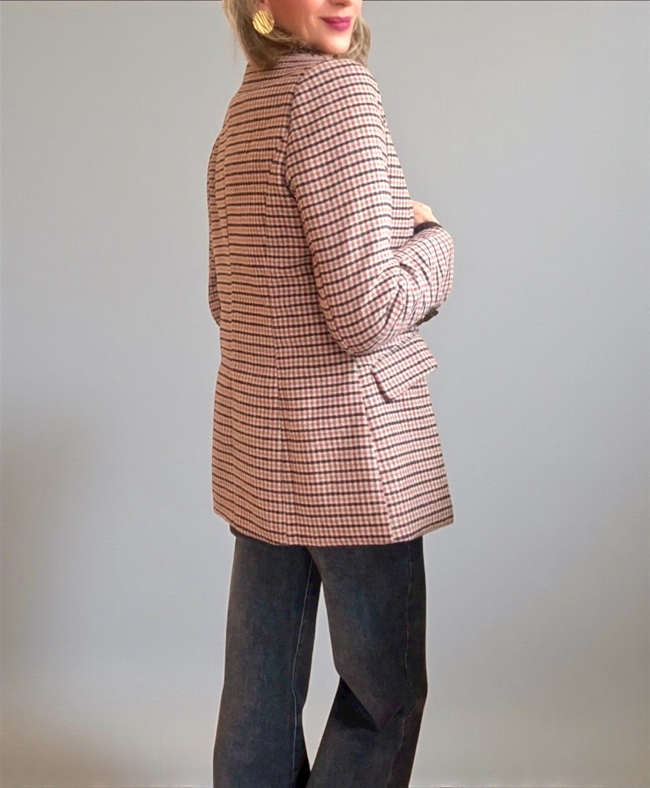 Blazer de cuadros escoceses en colores beige ,negro ,granate y verde .Cierre con botones .Bolsillos.Forro interior .Hombreras .
