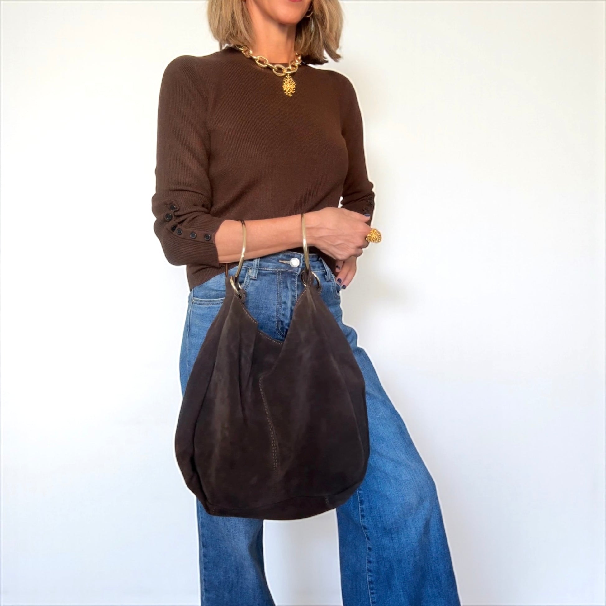Bolso de ante en color marrón oscuro .Asas en forma de anillas grandes doradas.Cierre con imán .Correa larga para llevar al hombro y bandolera.