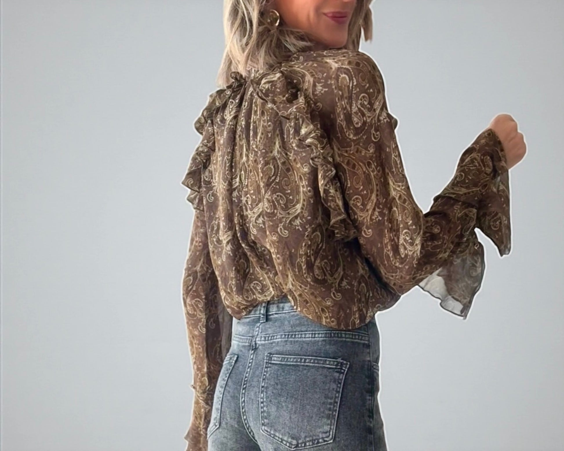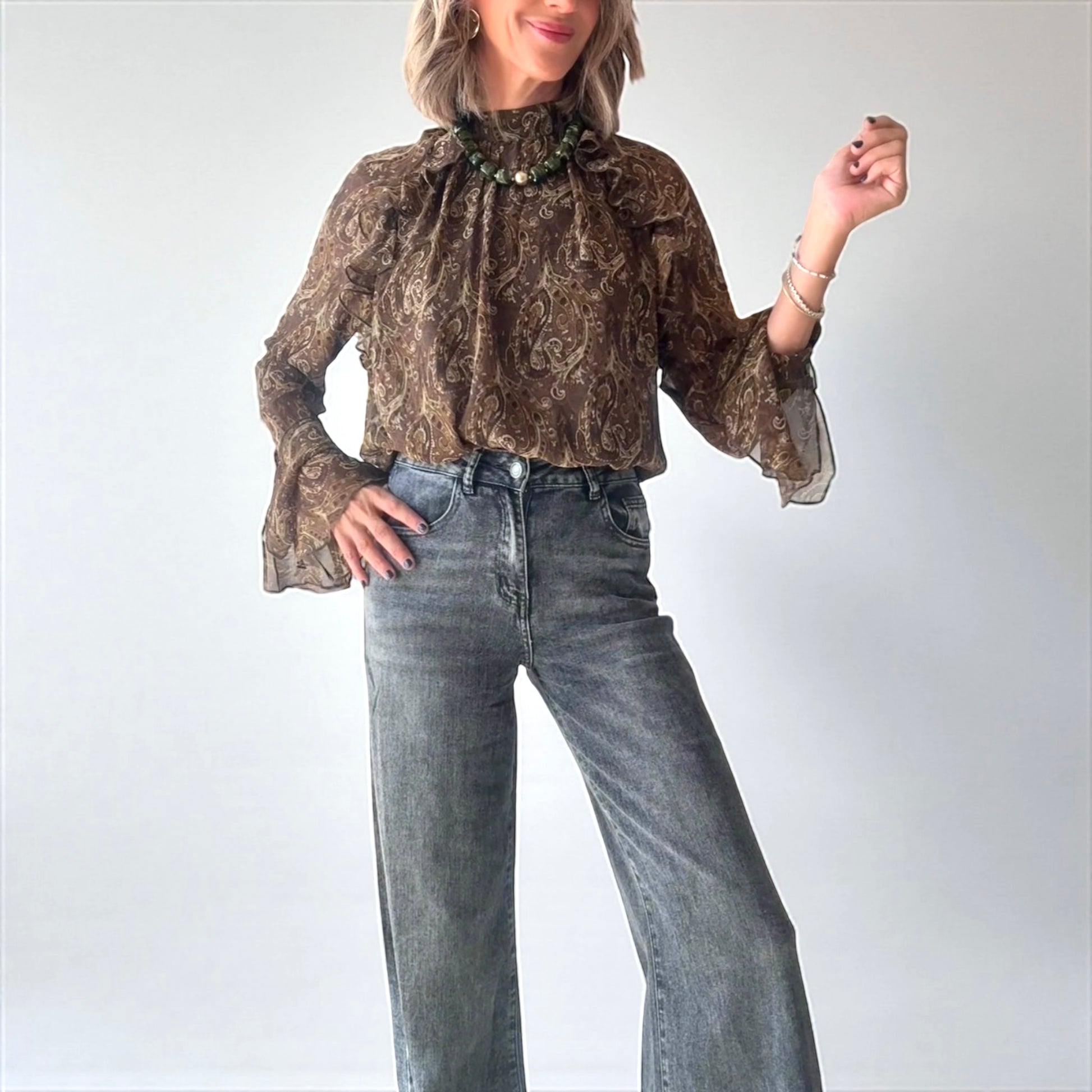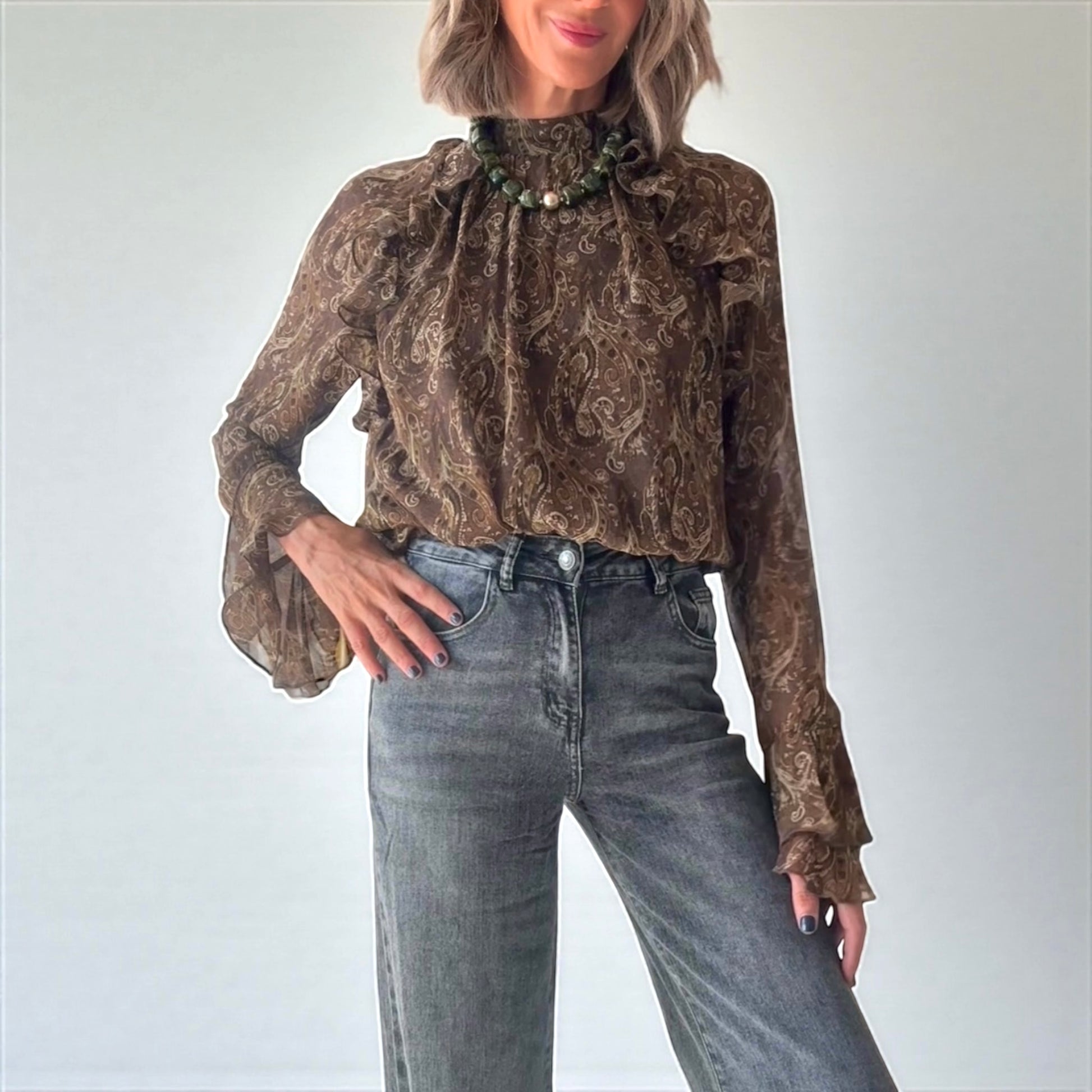 Camisa fluida con estampado cachemir en tonos marrones y verdes.Cierre con botón detrás del cuello.Manga larga acampanada en puños.Corte recto y suelto .Volantes en la parte de delante .