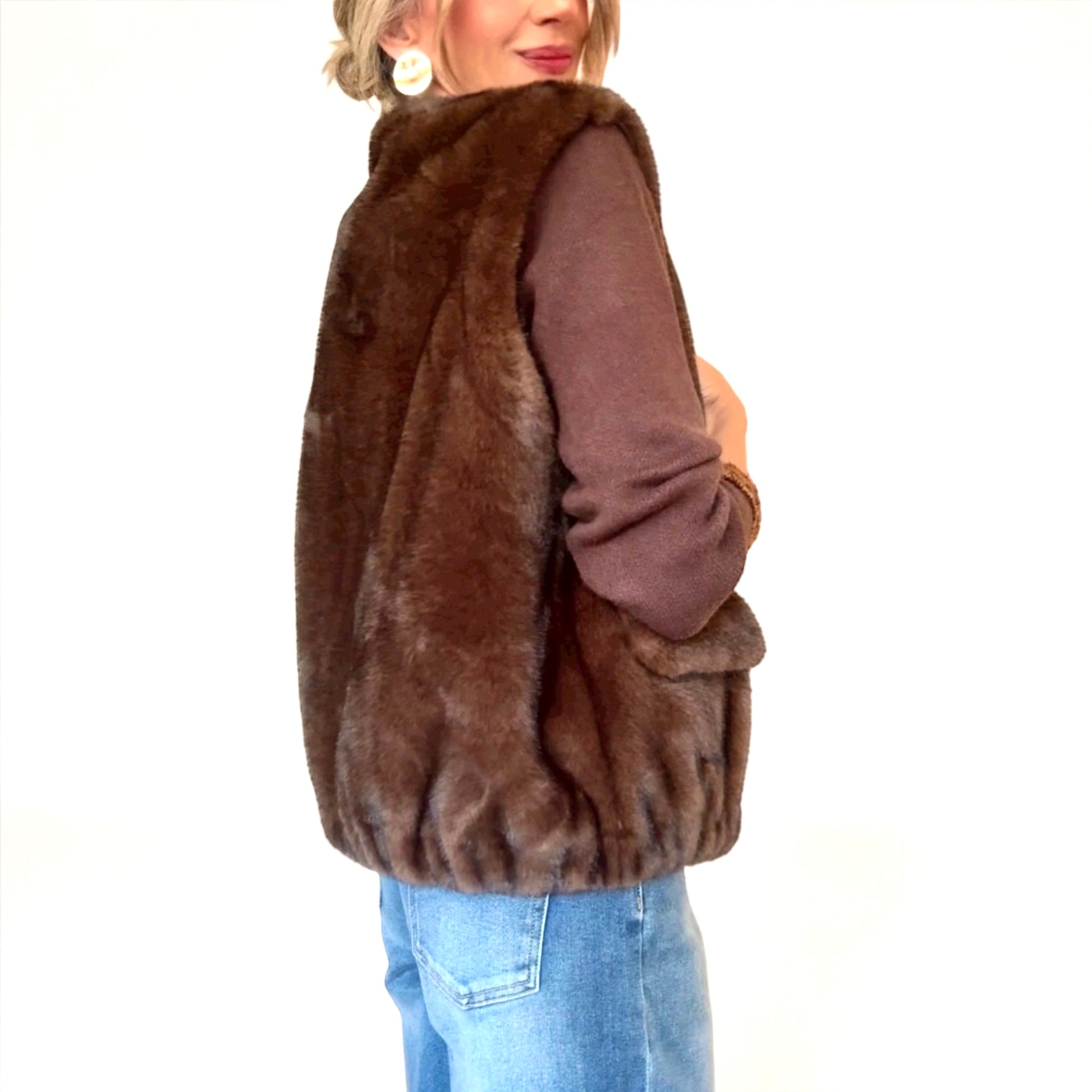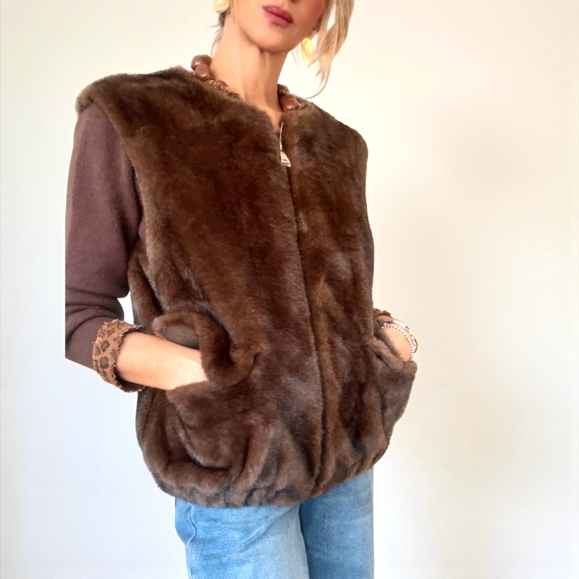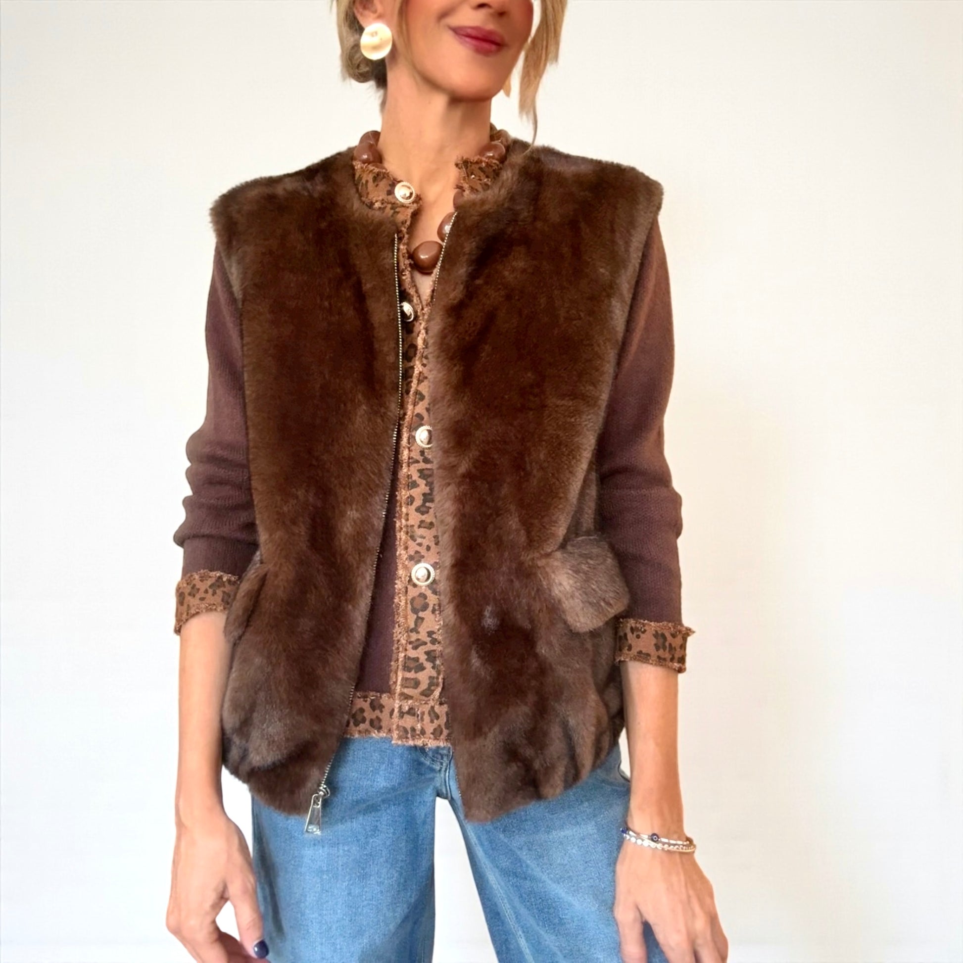 Chaleco de pelo sintético de calidad premium .Cierre con cremallera.Cuello redondo.Bolsillos delanteros.Goma elástica en la cintura .Color marrón .