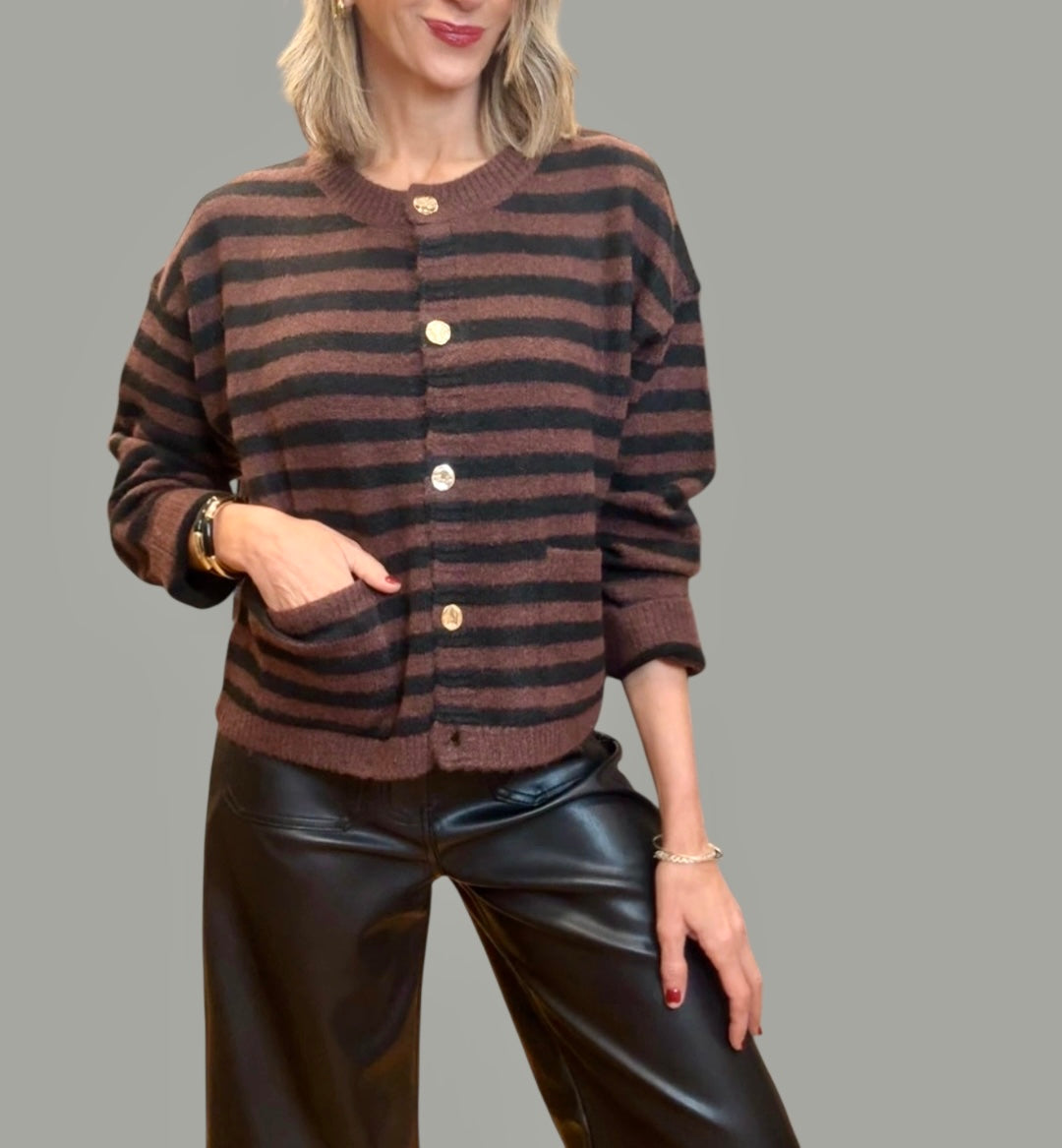 Chaqueta de punto de rayas en marrón y negro.Cuello redondo .Bolsillos delanteros.Cierre con botones en dorado.