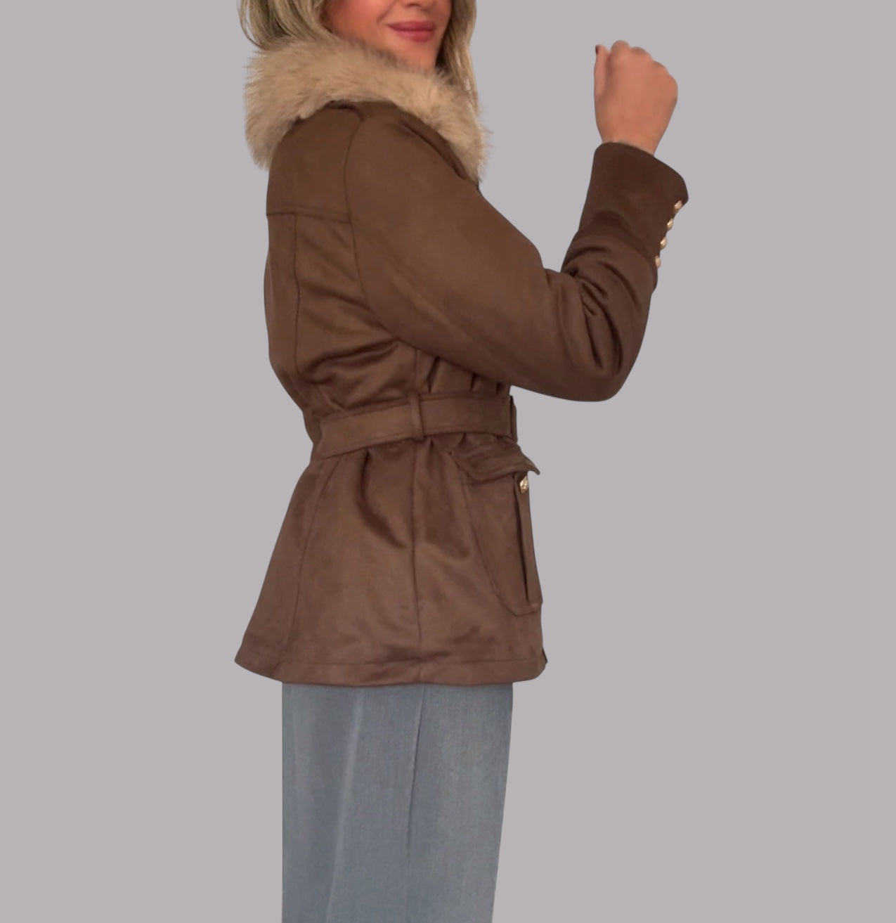 Chaqueta en tejido antelina y combinada con pelo en color camel.Cuello desmontable.Bolsillos delanteros .Cierre con botones en dorado .Forro en pelo corto y suave.