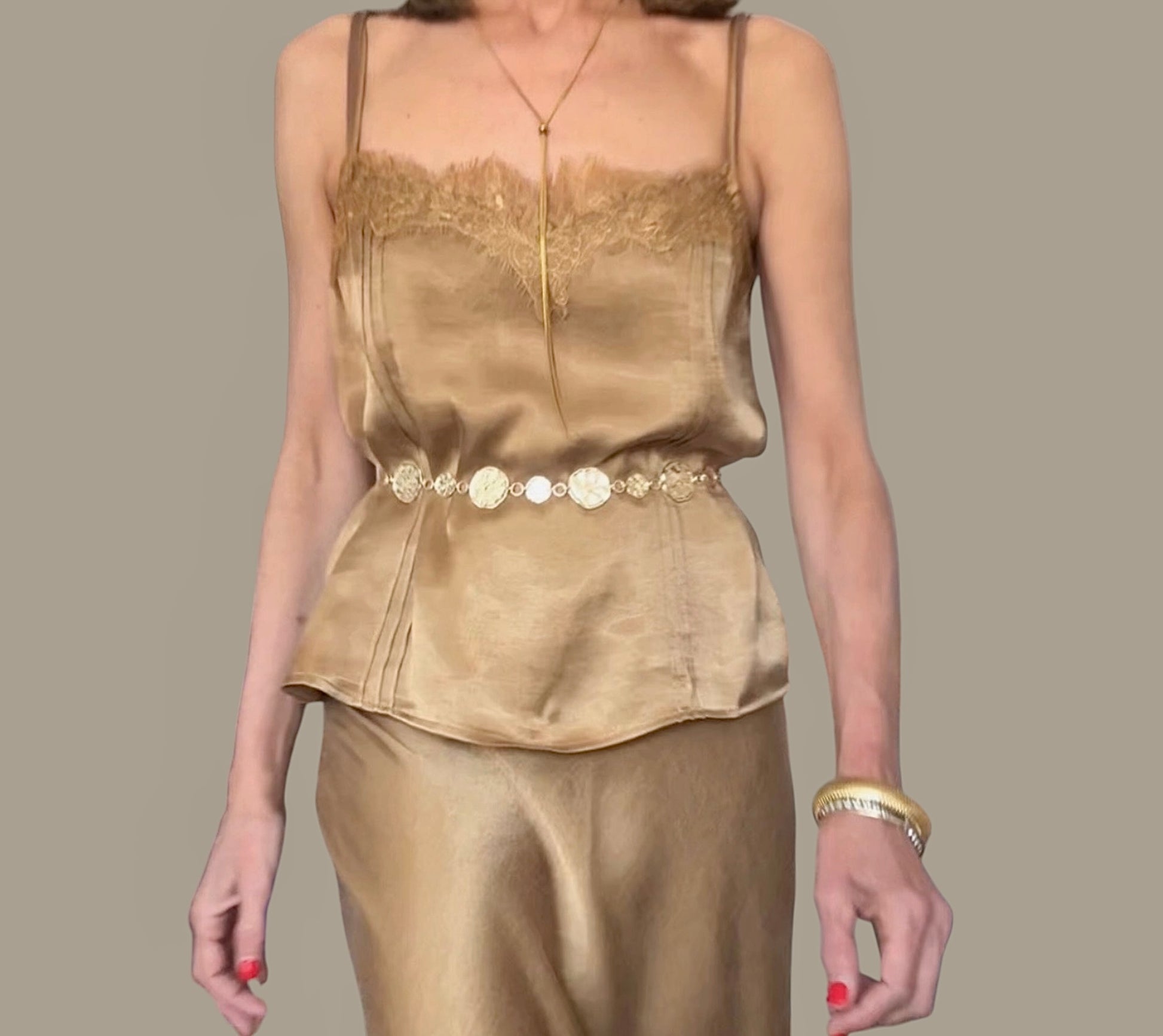 Cintura de cadena dorada con círculos entrecalados.