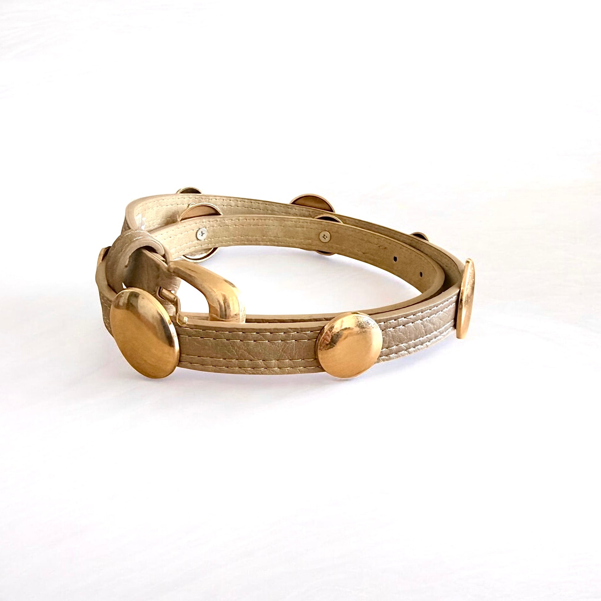 Cinturón en color beige.Detalle de círculos dorados rematados.Cierre dorado.