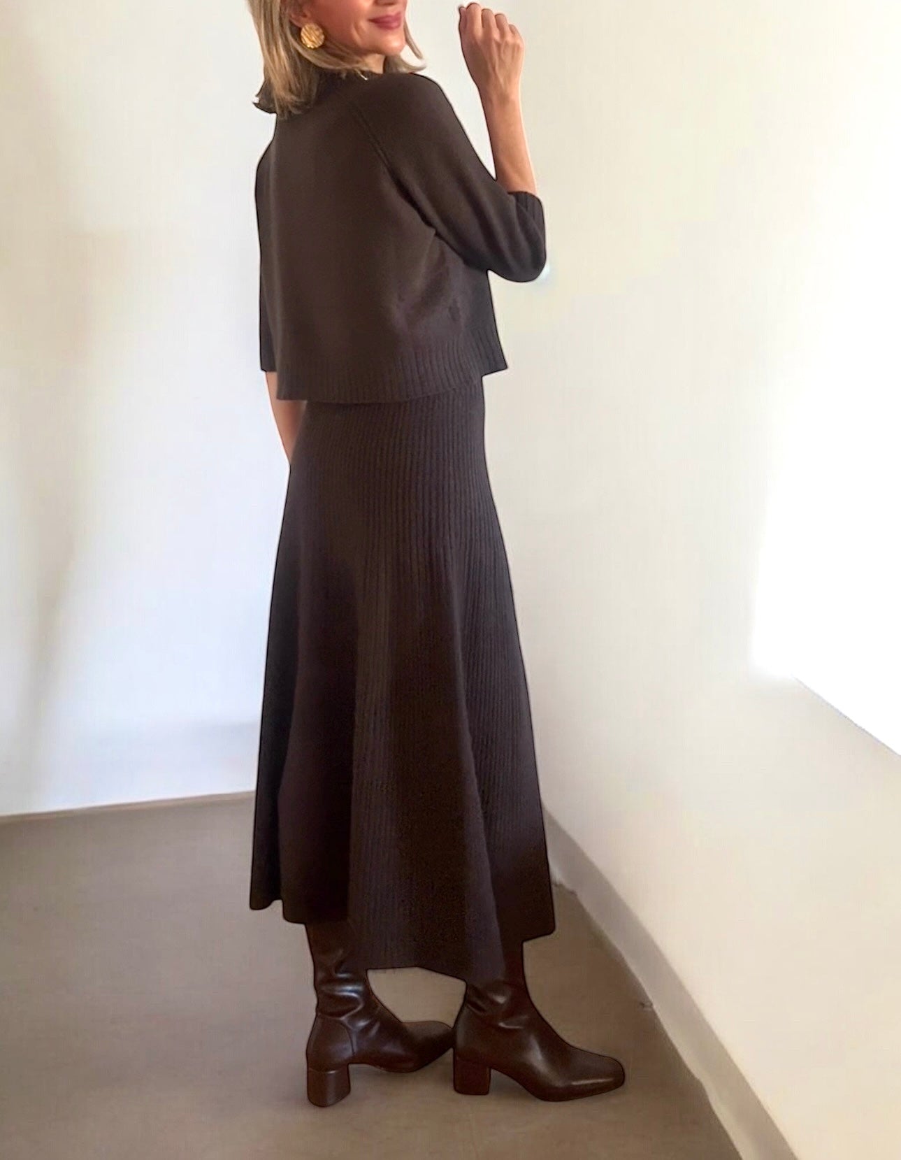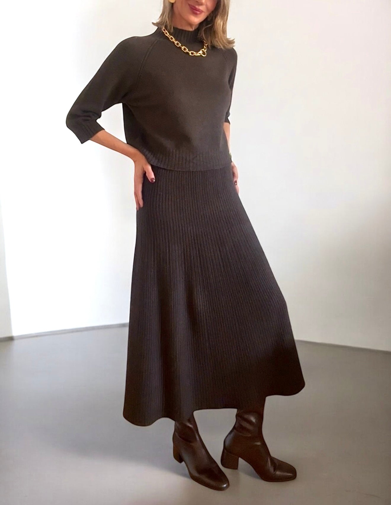 Conjunto de punto en color marrón.Jersey de punto suave en manga hasta el codo.Falda en punto canalé y corte evasé.