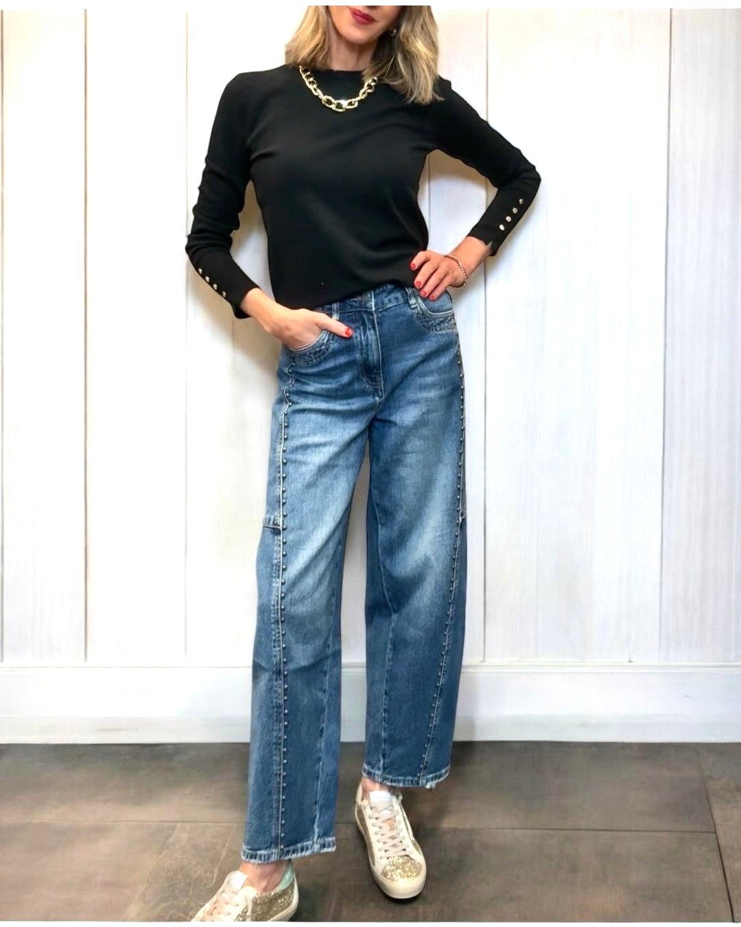 Pantalón vaquero en color azul desgastado .Modelo barrel / balloom.Detalle de tachuelas en los laterales.Bolsillos .Cierre con botón y cremallera.