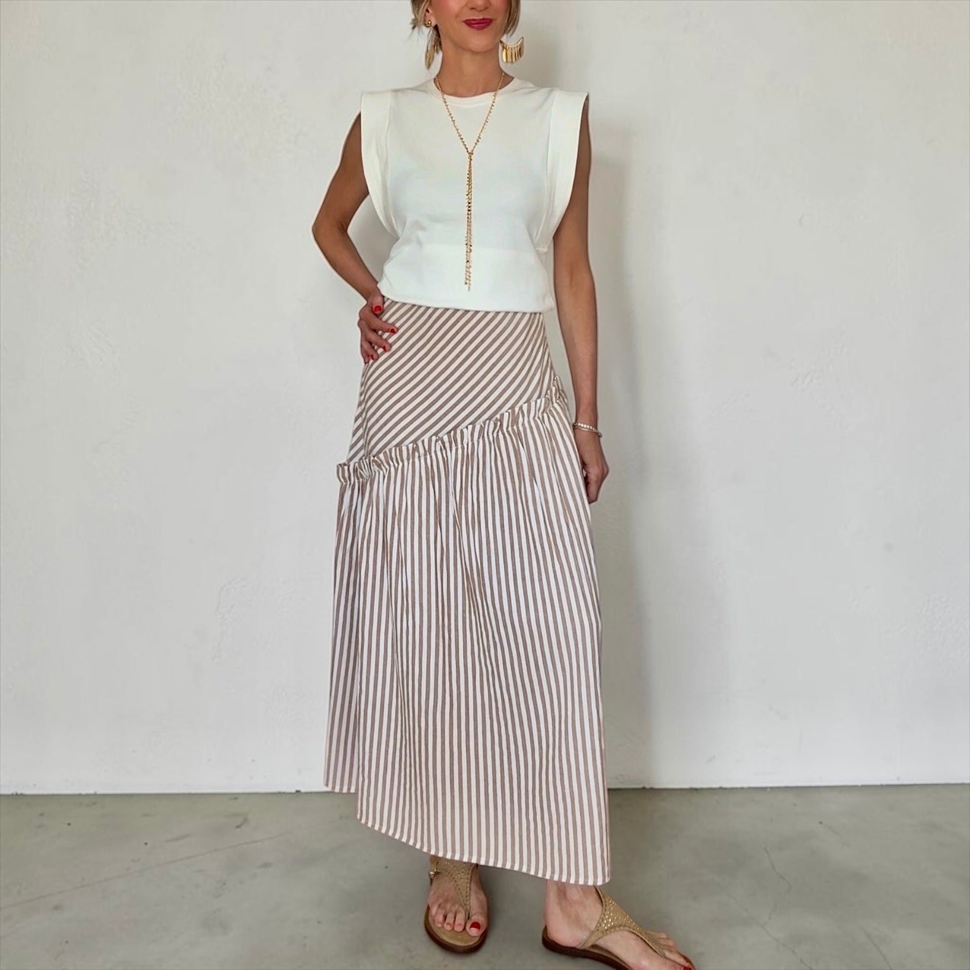 La falda es de tiro alto y de largo midi , con un diseño llamativo de rayas verticales en camel y blanco. En la parte superior, las rayas forman un patrón en forma de “V” que estiliza la cintura. A partir de ahí, la falda se abre con un corte fruncido, creando volumen y movimiento en la parte inferior. Goma elástica en la parte de detrás de la cintura.Cierre con cremallera en un lado.