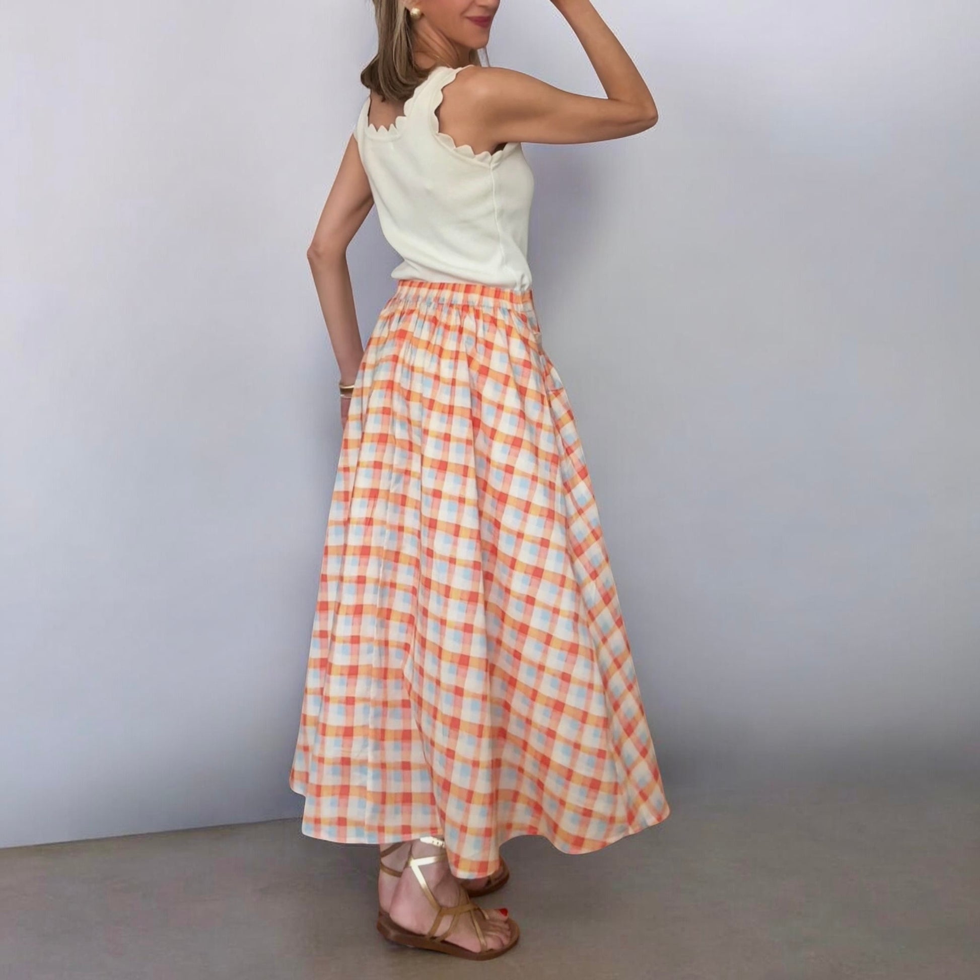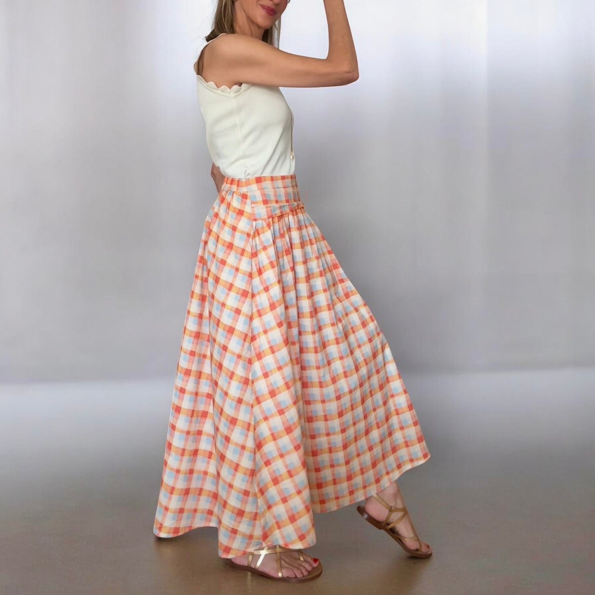 Falda vaporosa en estampado de cuadros en colores beige,naranja y azul celeste.Goma elástica en la parte de detrás de la cintura .Cintura ancha en la parte de delante a modo de pliegues.Forro interior.