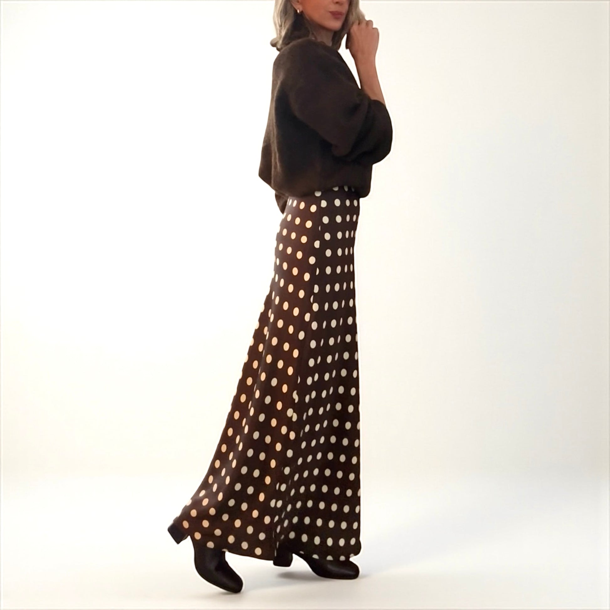 Falda topos en tejido satinado y fluido.Color marrón y topos beige.Goma elástica en cintura .