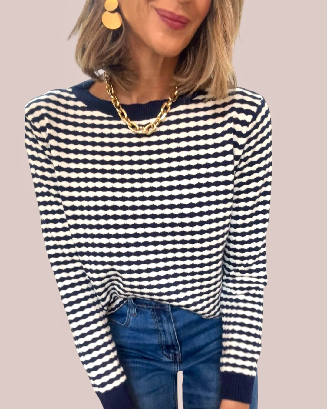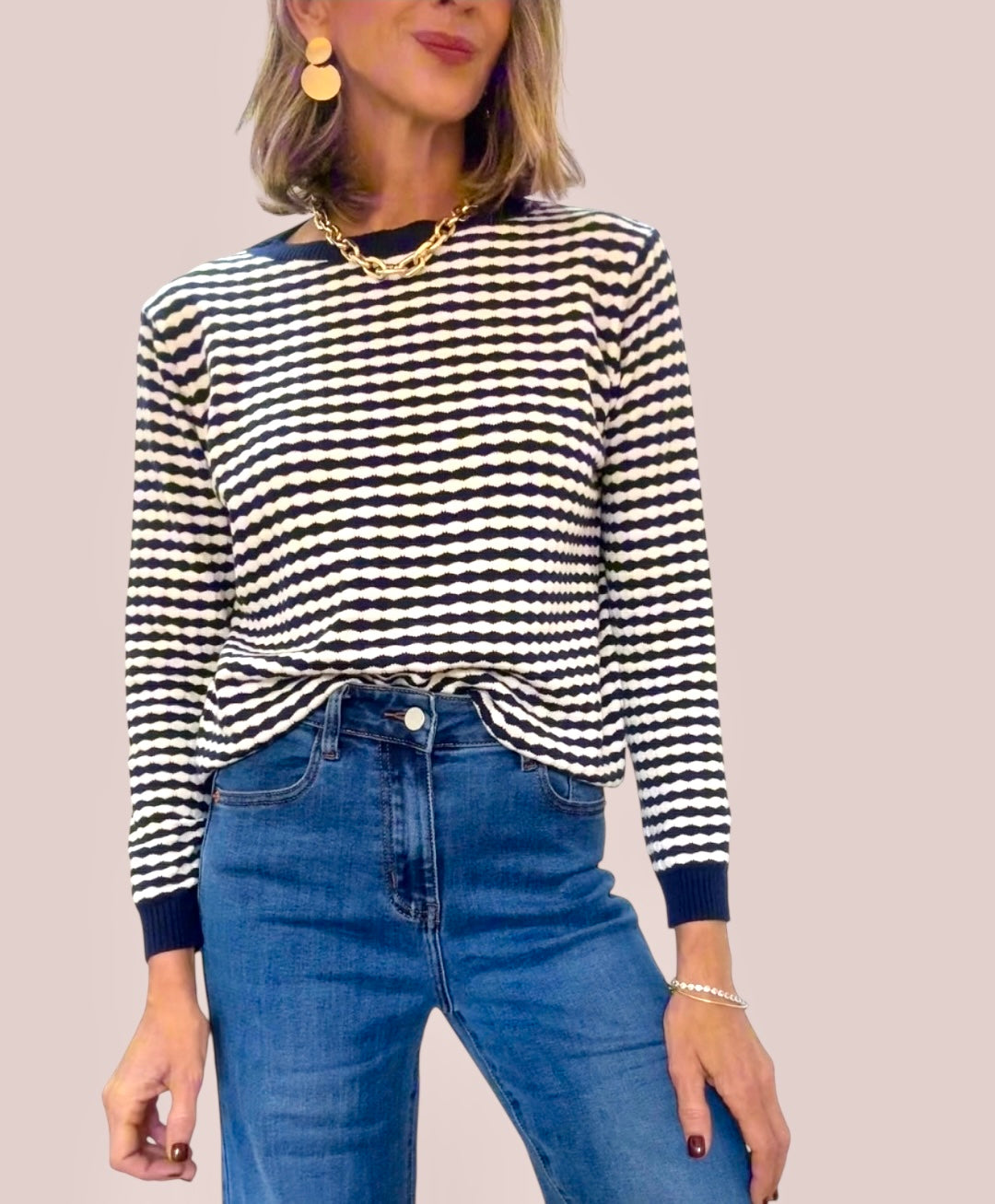 Jersey de punto suave en color azul marino y blanco .Cuello redondo .