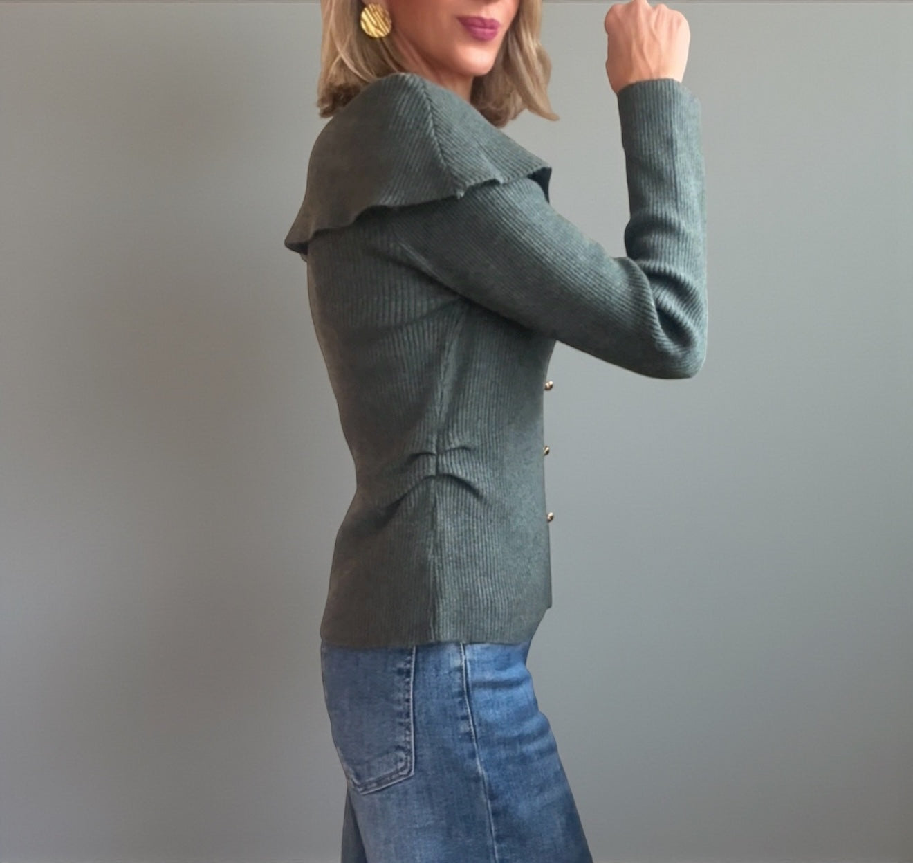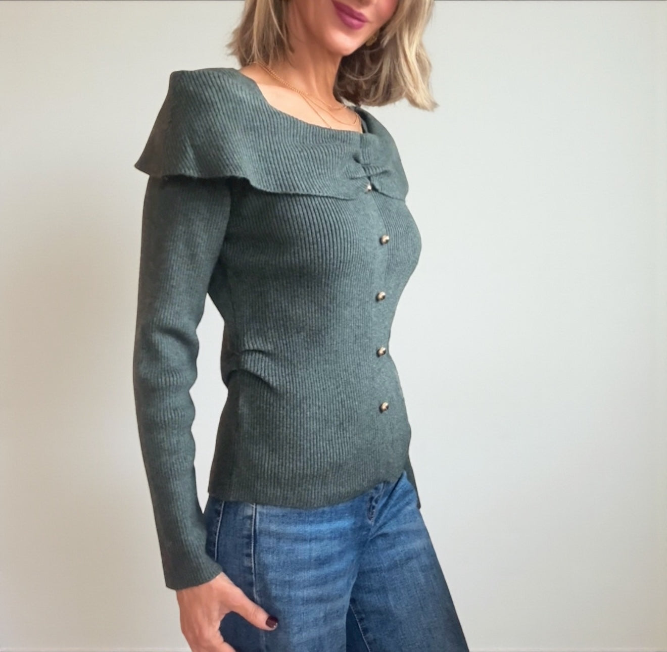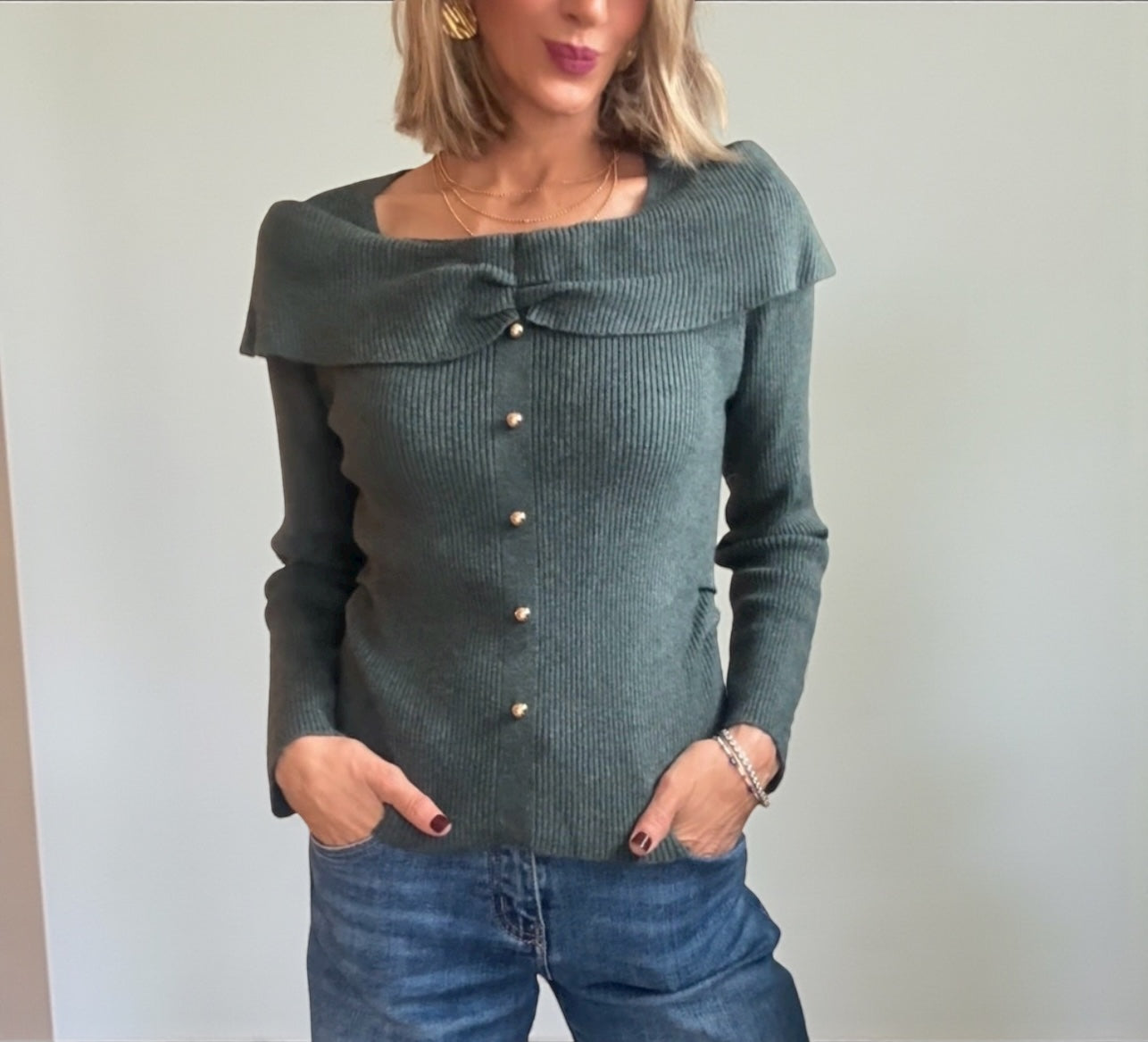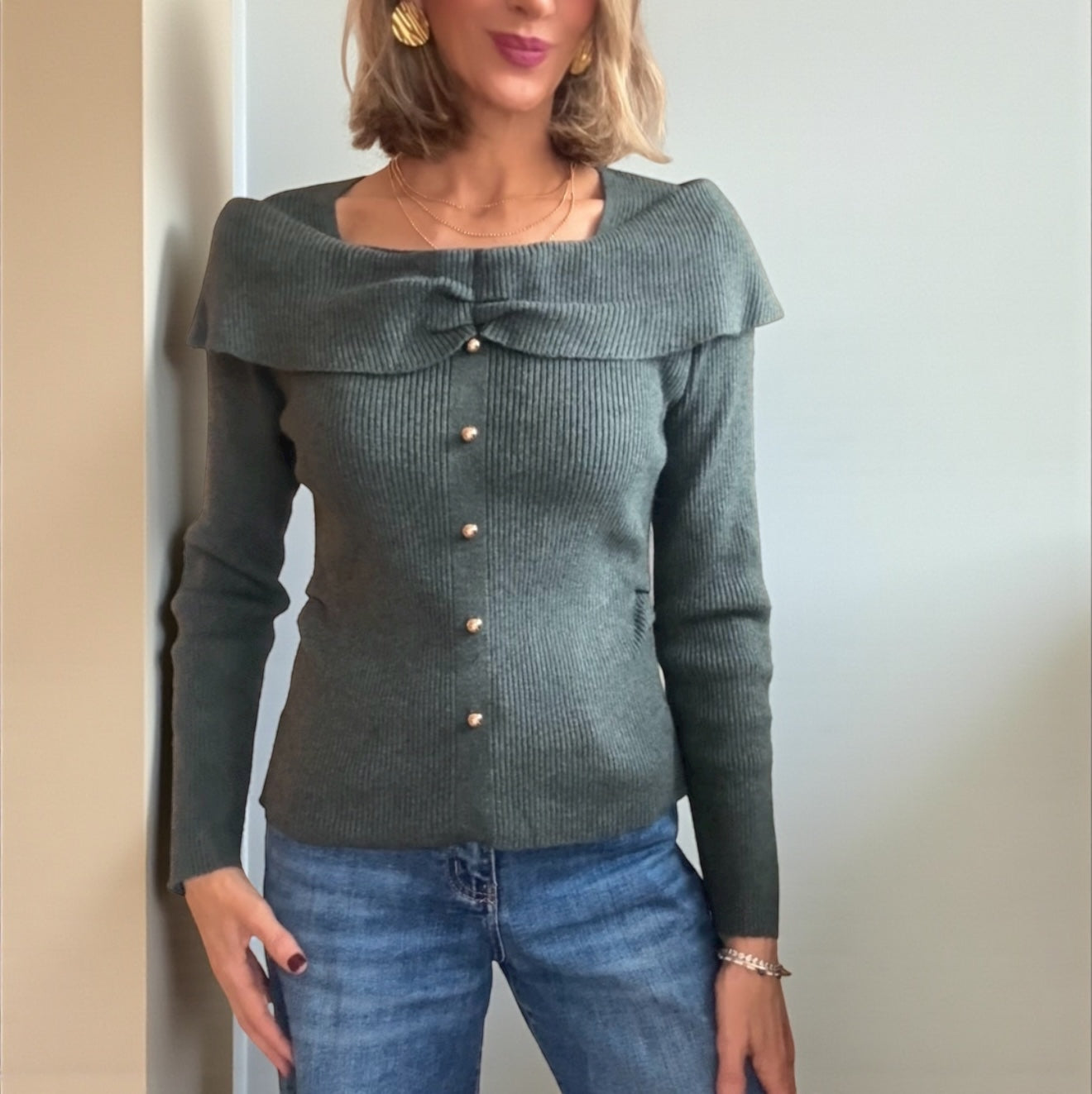 Jersey de punto canalé en color verde grisáceo .. .Detalle de botones dorados decorativos .Fruncido en ambos lados de la cintura.Escote en forma de barco con solapa que cae sobre hombros .