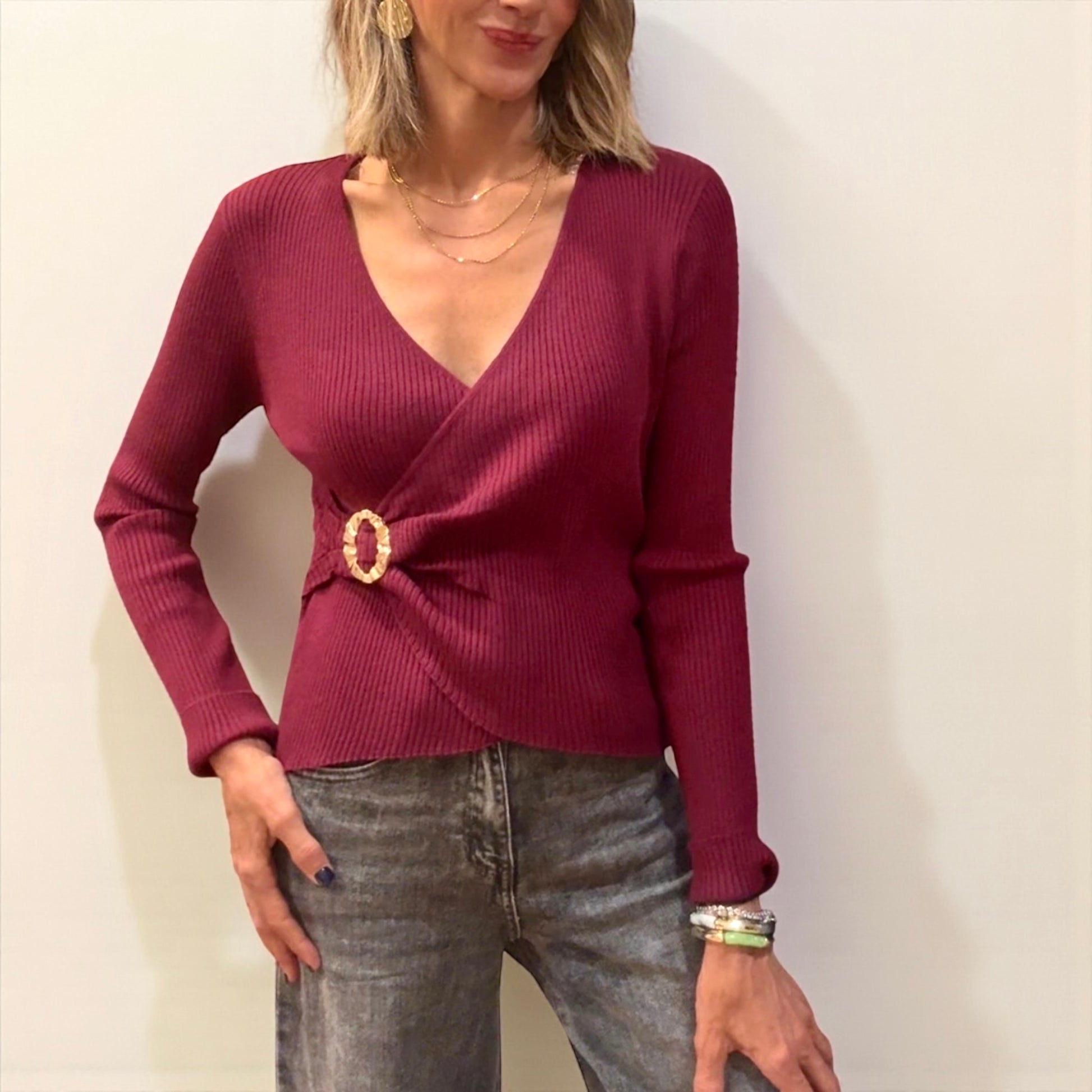 Jersey de punto canalé en color burdeos.Escote pico.Cruzado en la parte de delante y con el detalle de hebilla dorada en un lado.