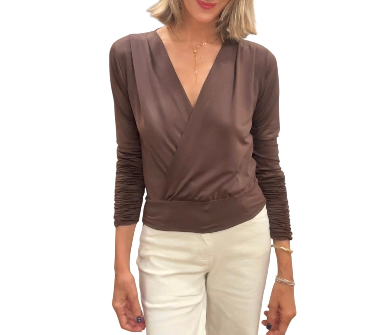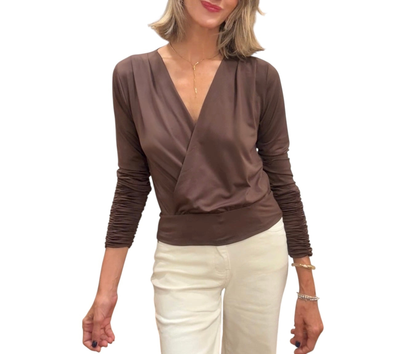 Jersey en tejido de punto frío .Color marrón .Escote pico.Detalle de fruncido en puños .