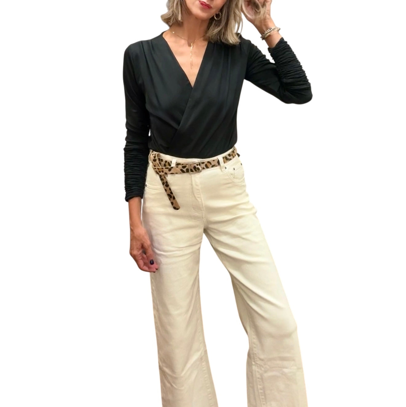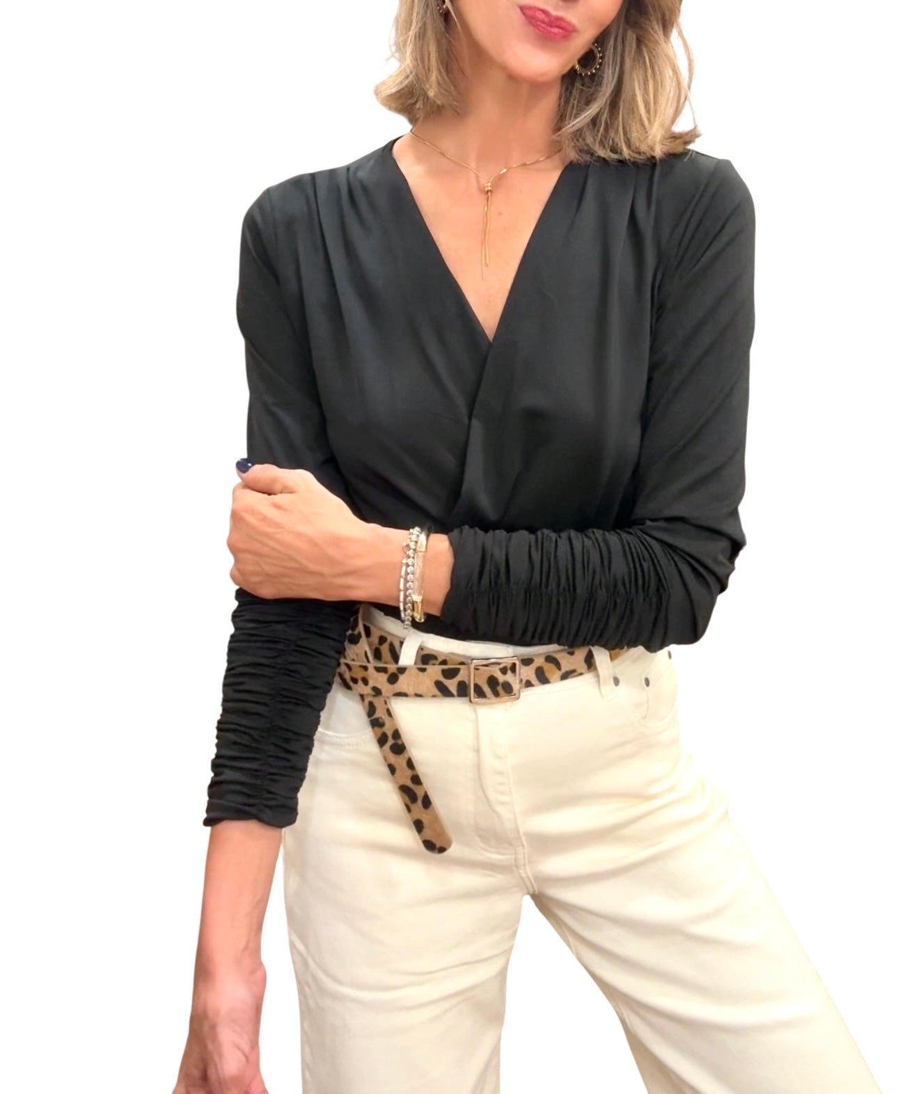 Jersey en tejido de punto frío .Color negro.Escote pico.Detalle de fruncido en puños .