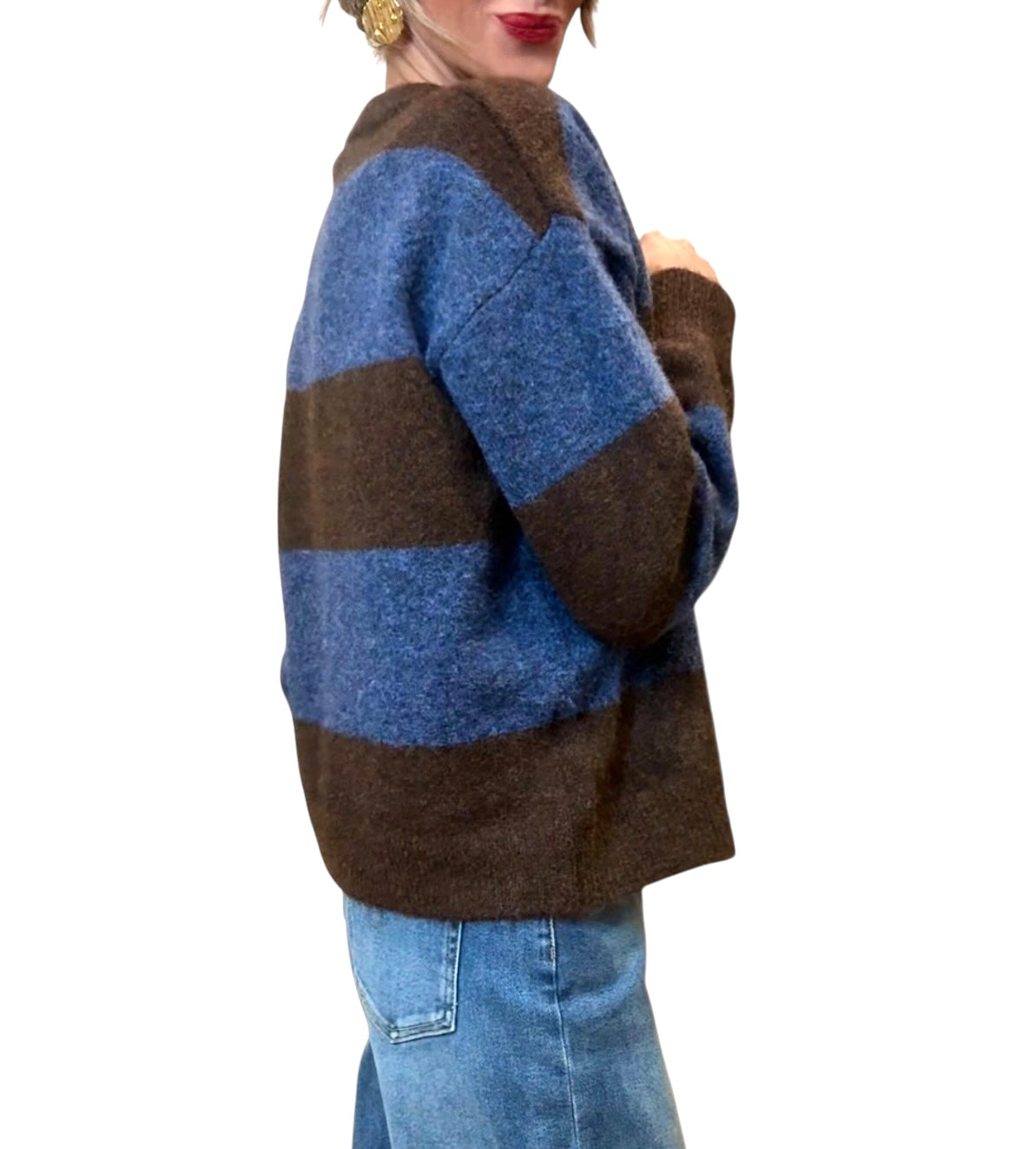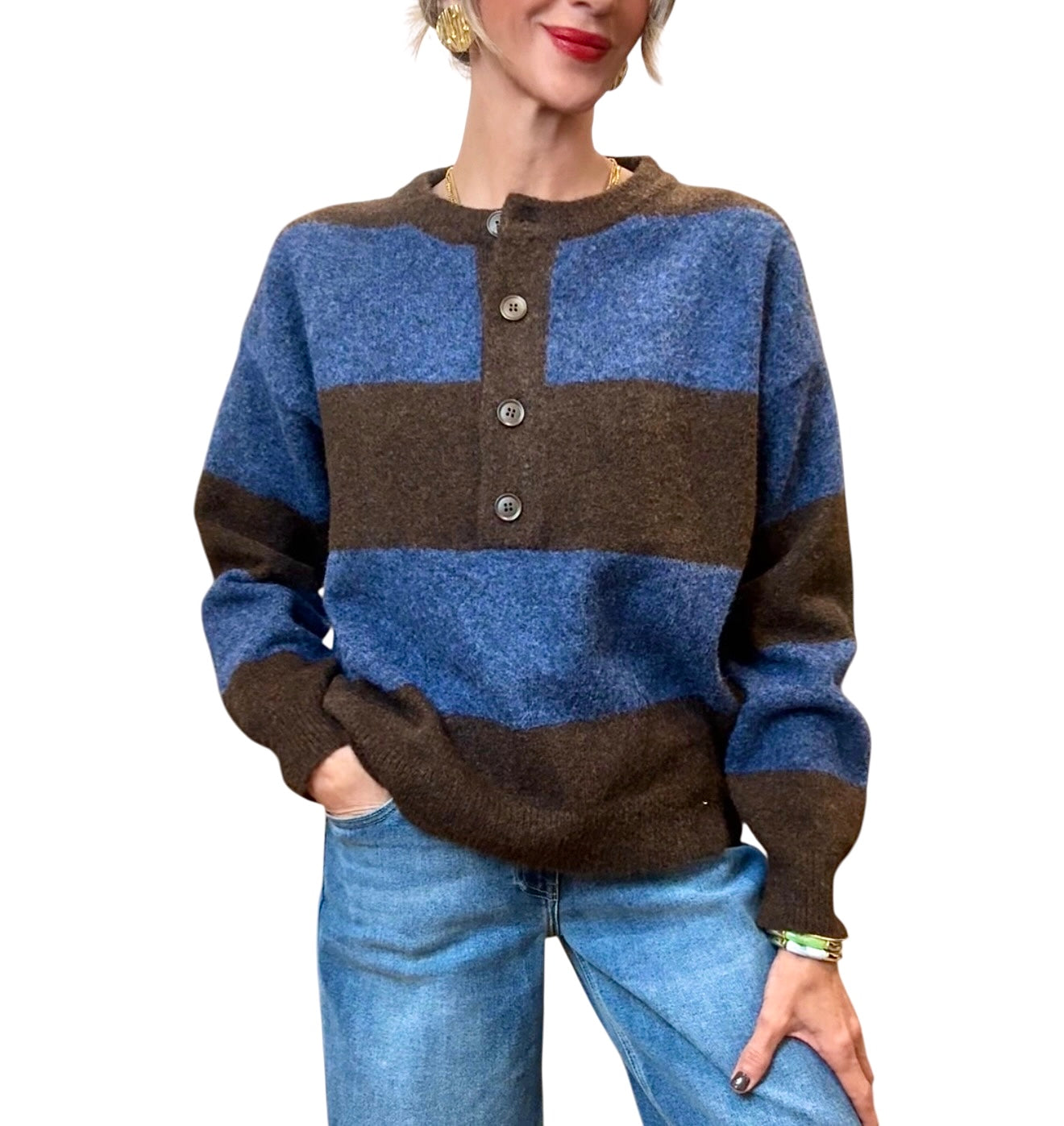 Jersey de punto a rayas en color azul y marrón .cuello redondo con botones .