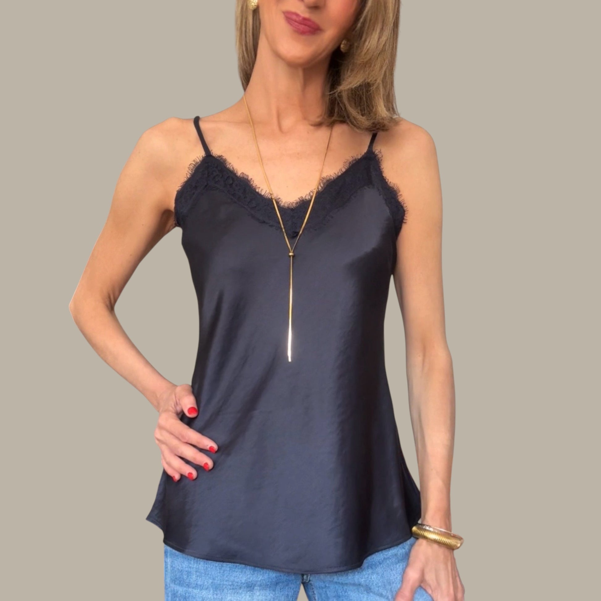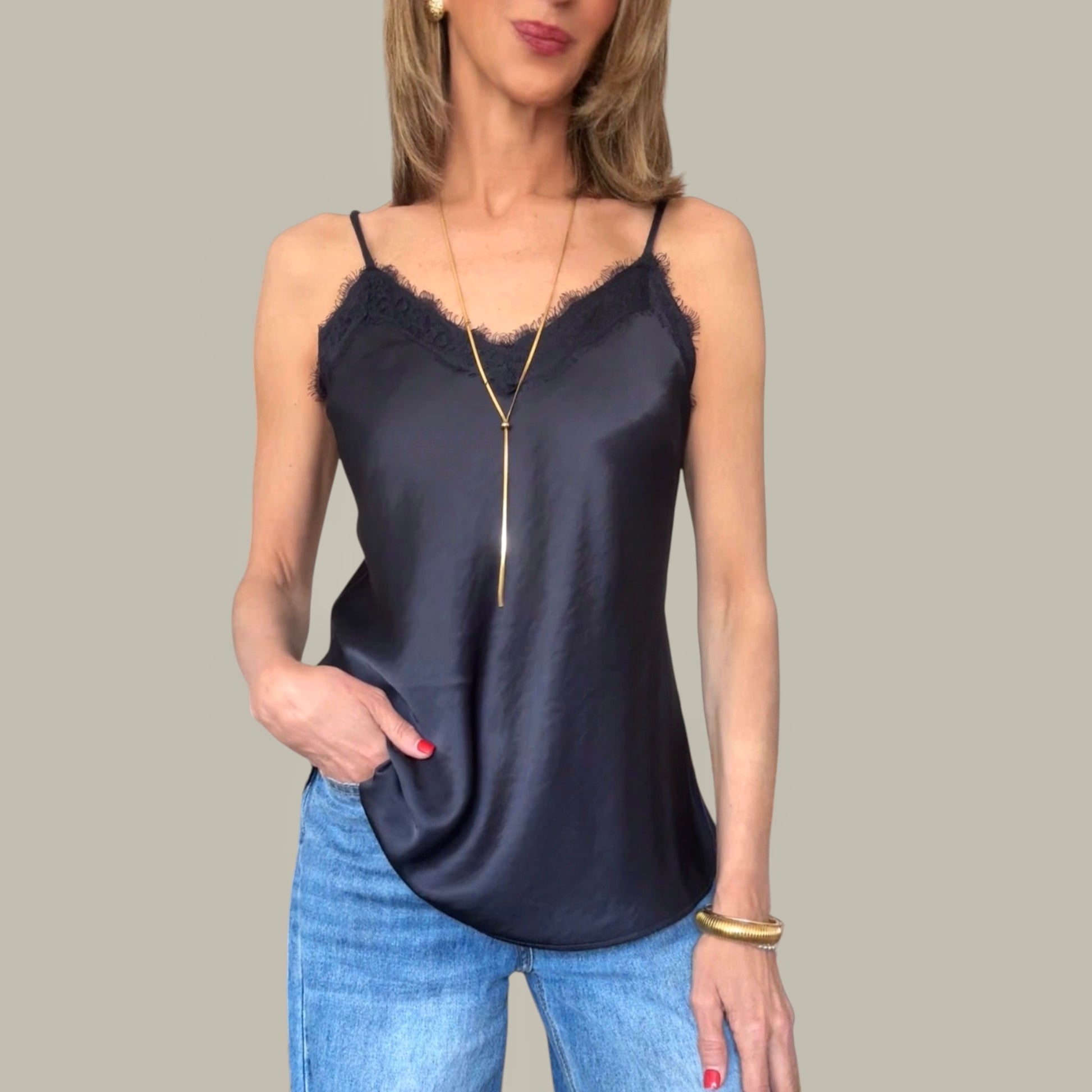 Top lencero en color azul marino y efecto satinado.Tirantes ajustables.Detalle de encaje en la parte de arriba de delante.Goma elástica en la parte de la espalda .