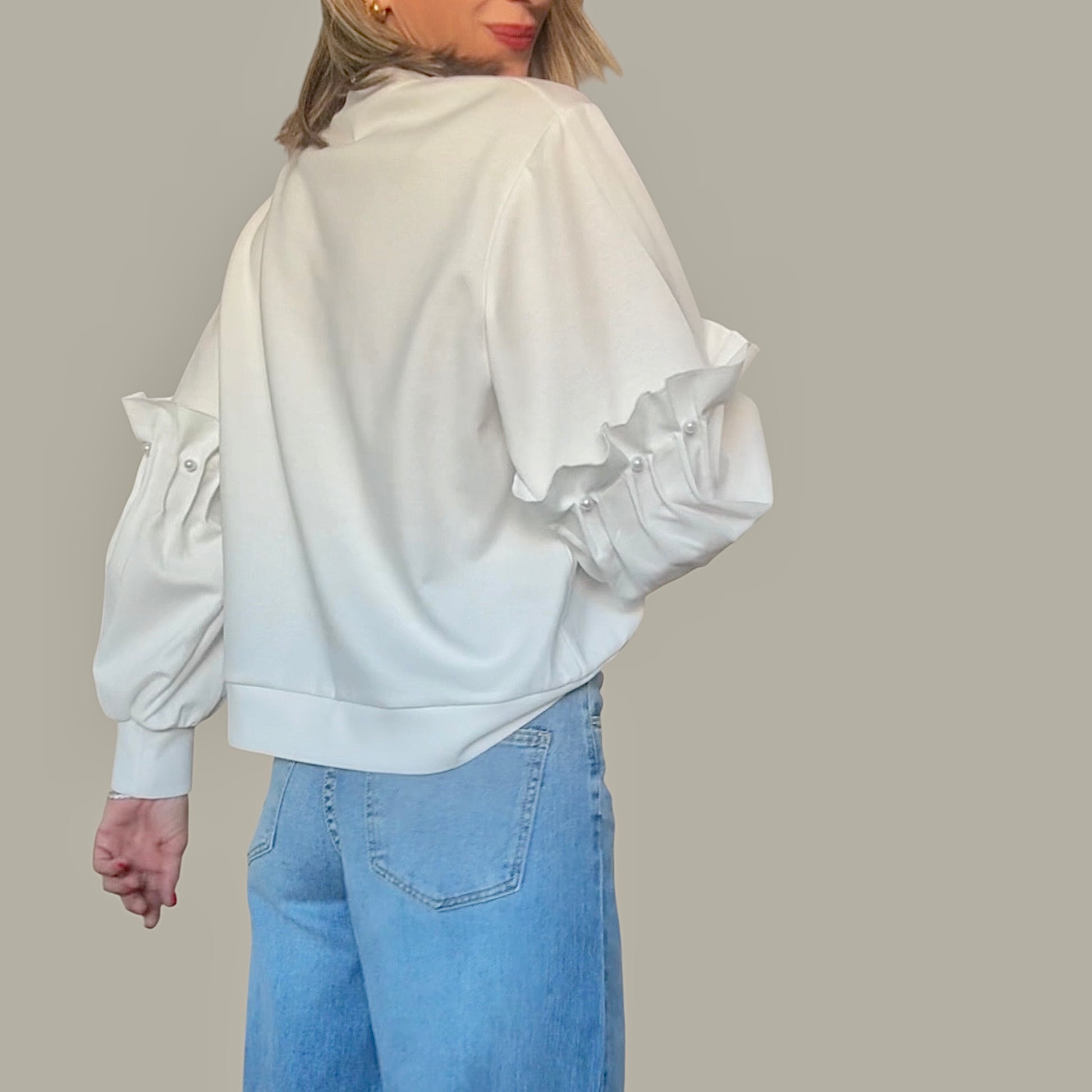 Sudadera en color blanco y tejido suave.Detalle de perlas y volantes en la mitad de las mangas.Cuello redondo .