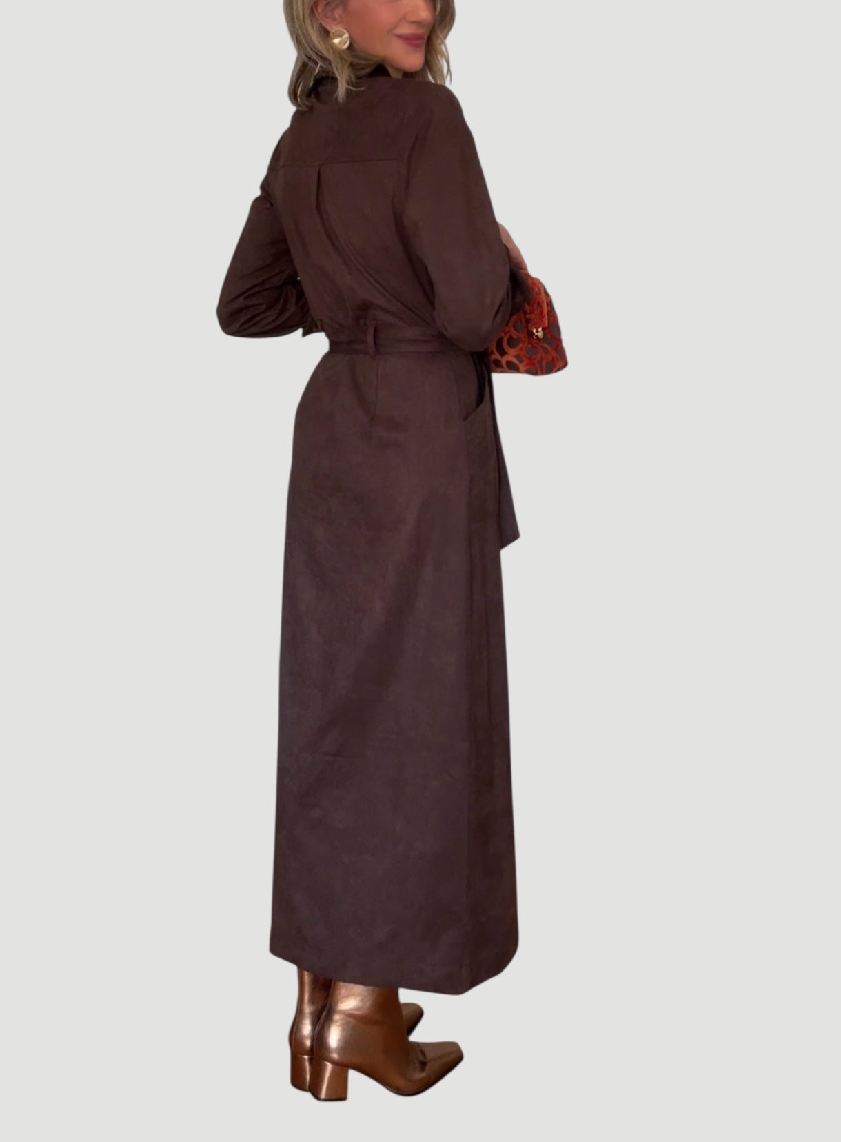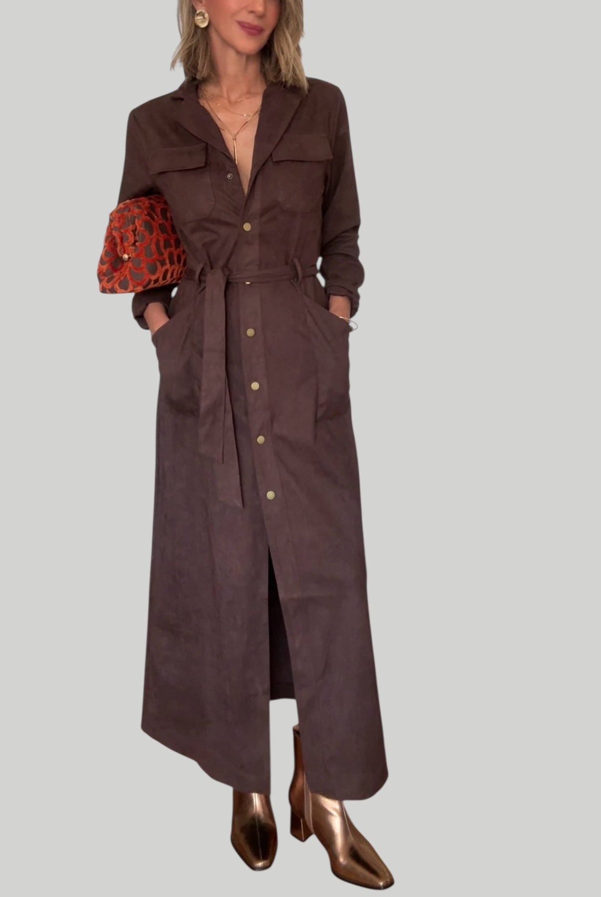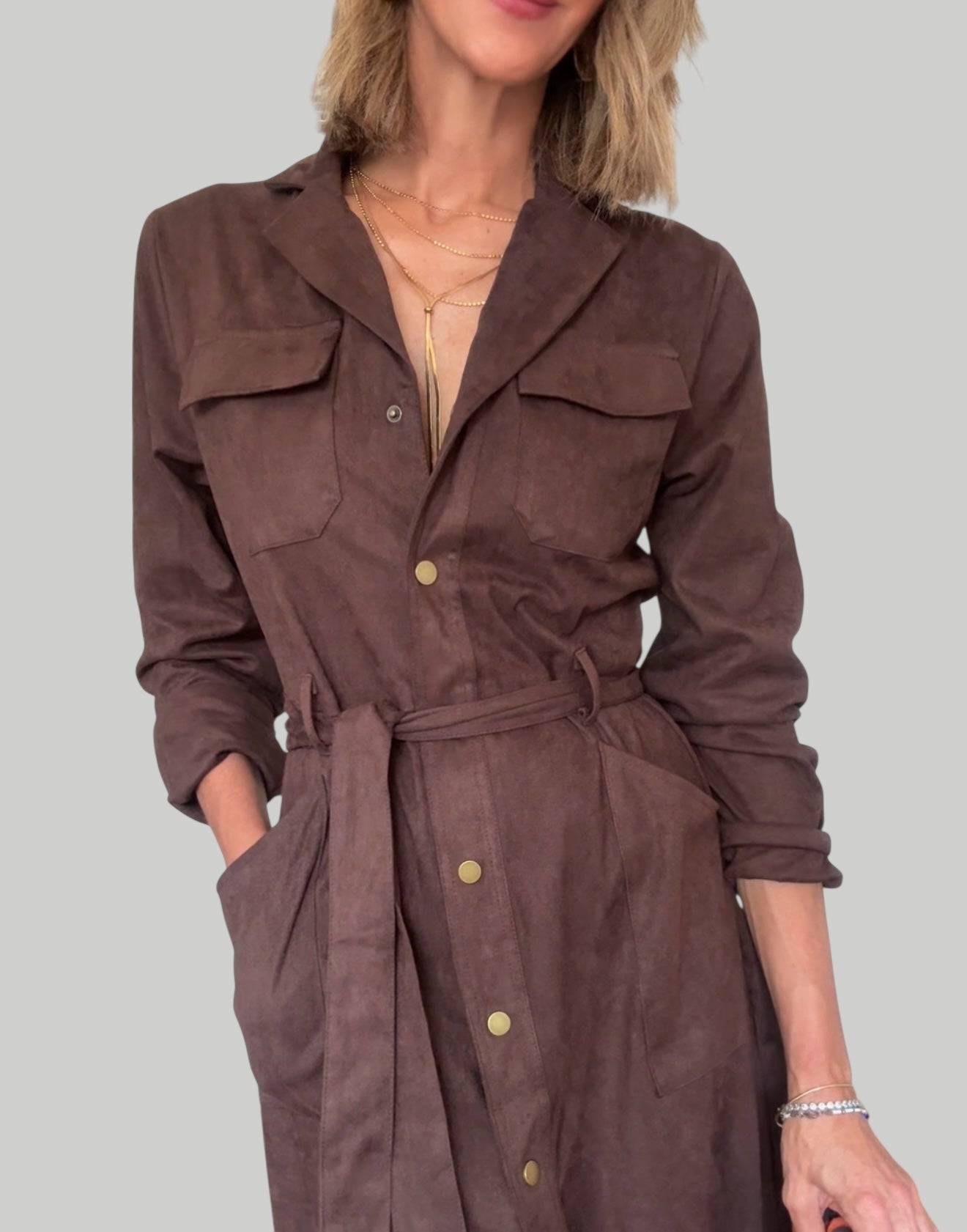 Vestido de antelina en color marrón .Cierre con botones automáticos .Bolsillos delanteros .Incluye cinturón .Tejido ligeramente elástico .