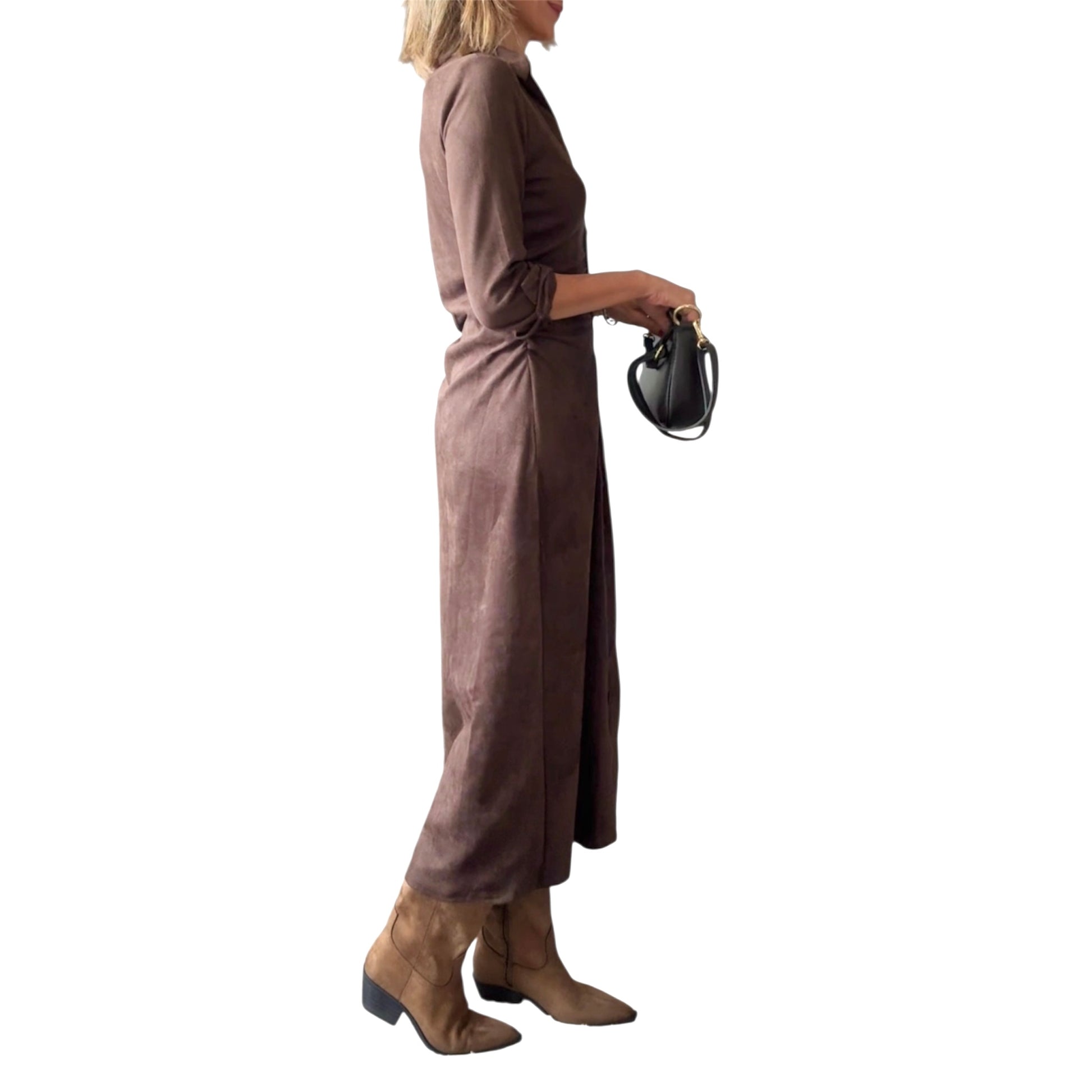 Vestido en tejido de antelina.Cierre con botones de arriba a abajo.Escote pico.Detalle de fruncido en la parte de delante.El tejido es elástico .