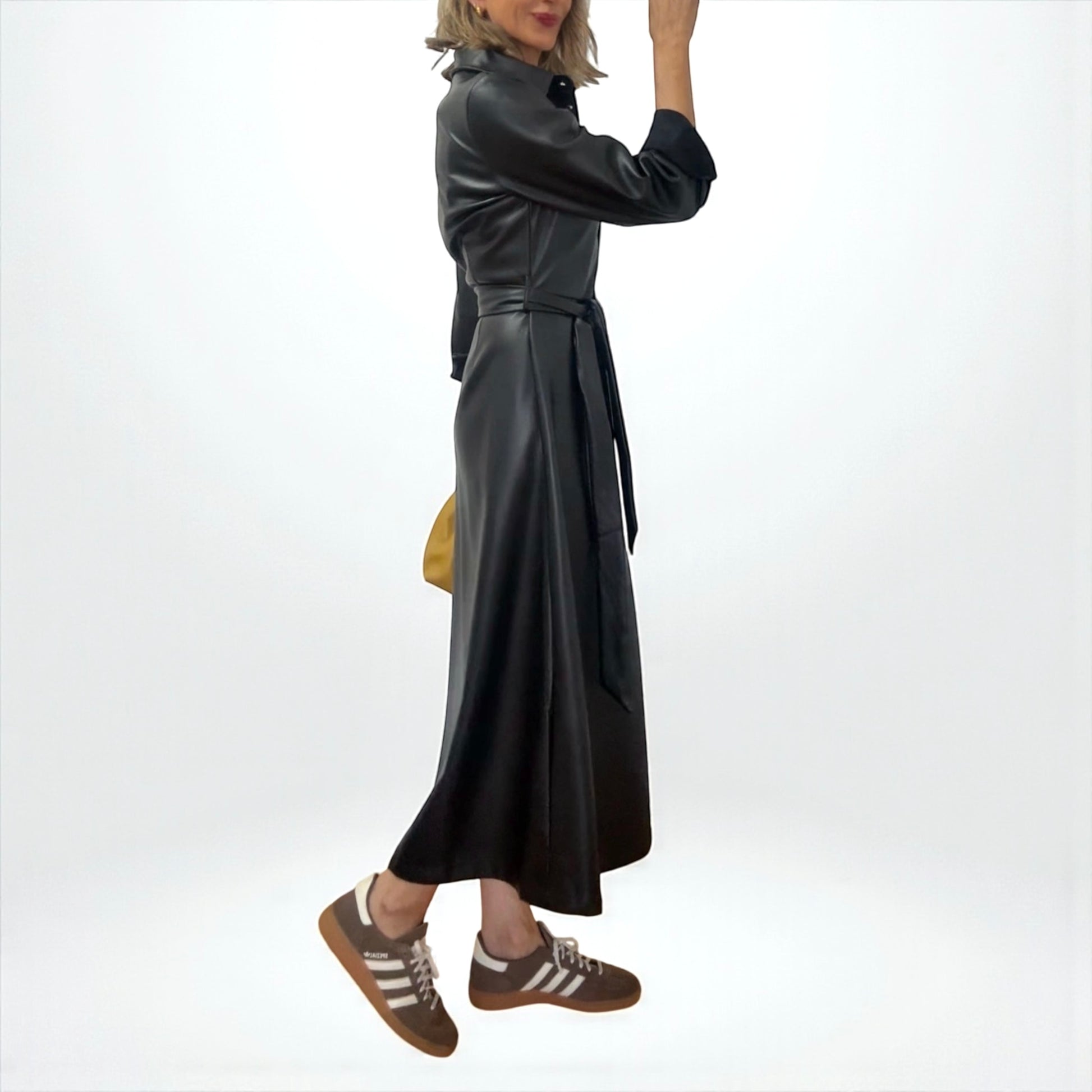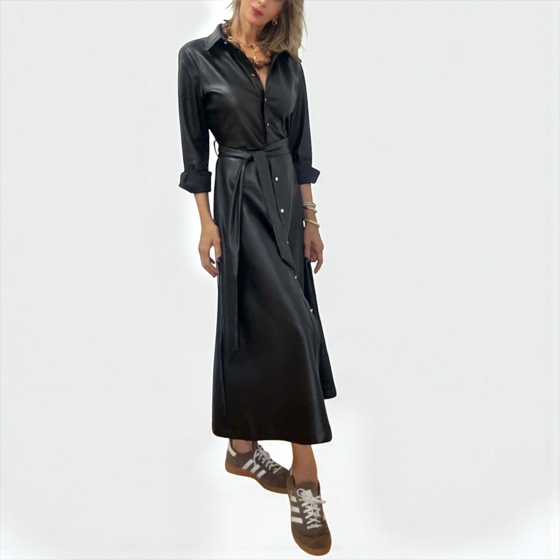 Vestido camisero de polipiel en color negro.Cierre con botones dorados de arriba a abajo. Cinturón .Tejido abrigado.