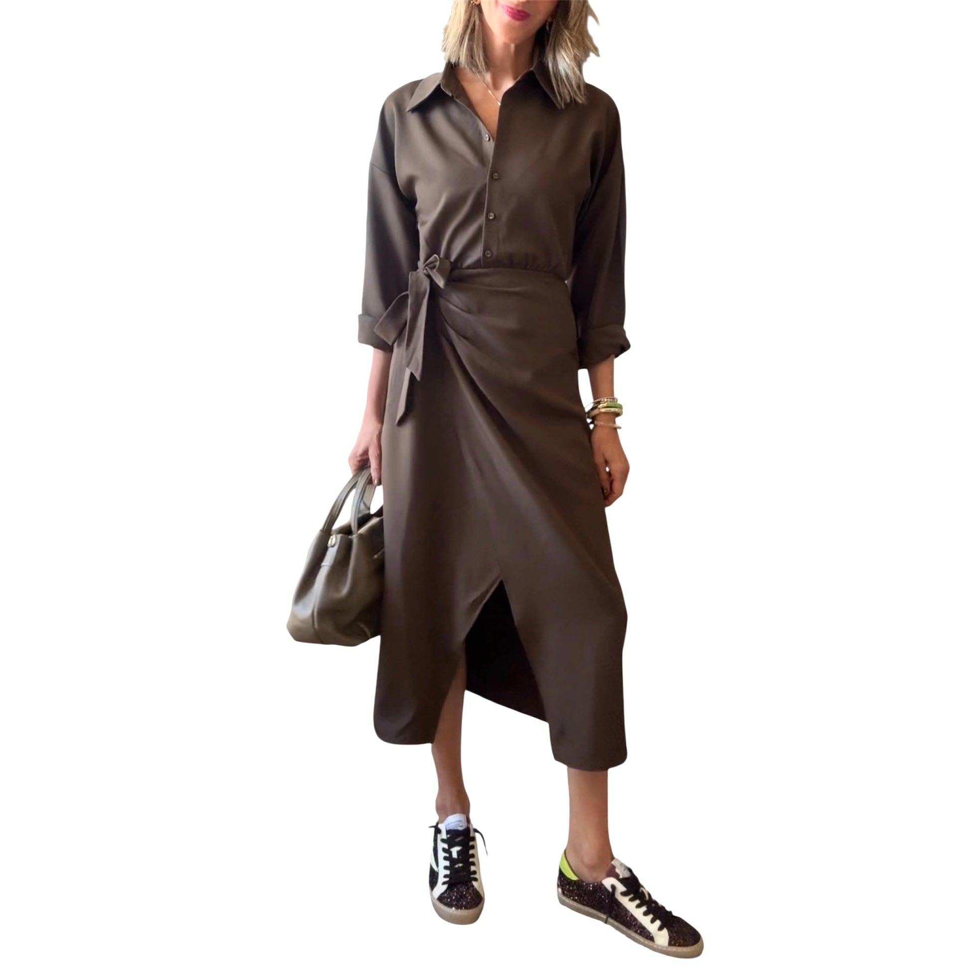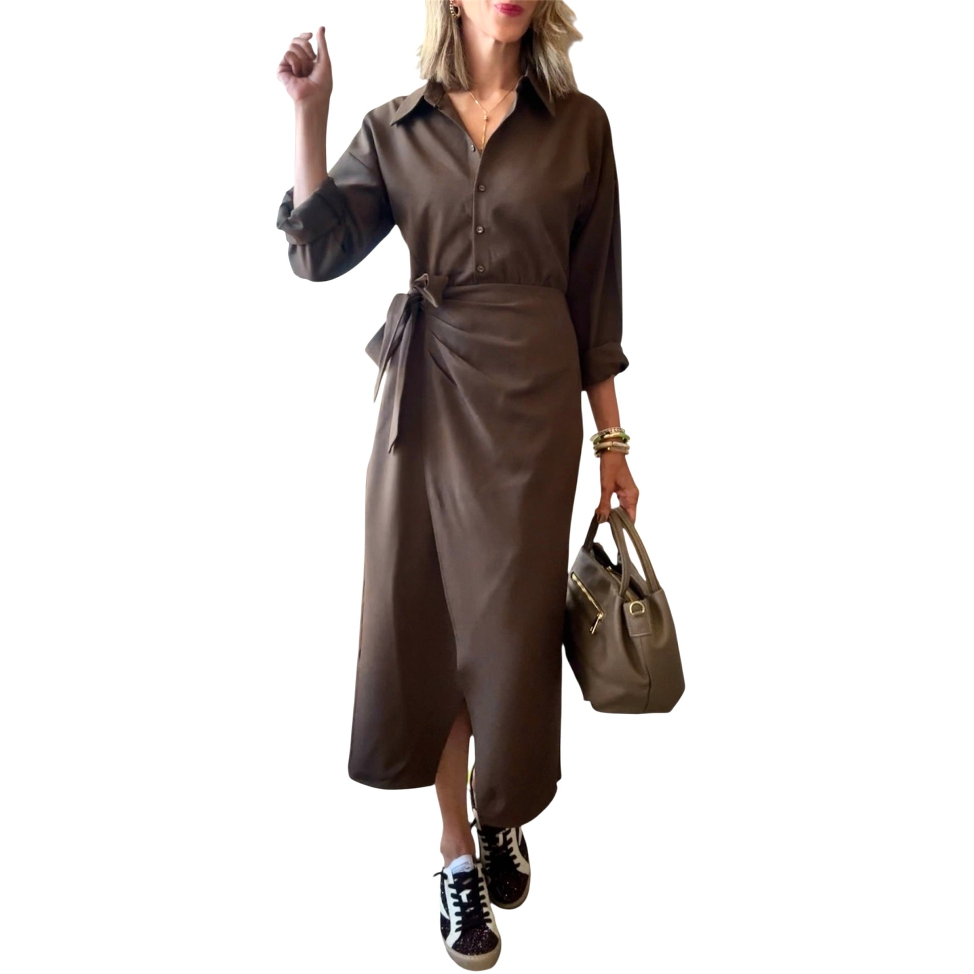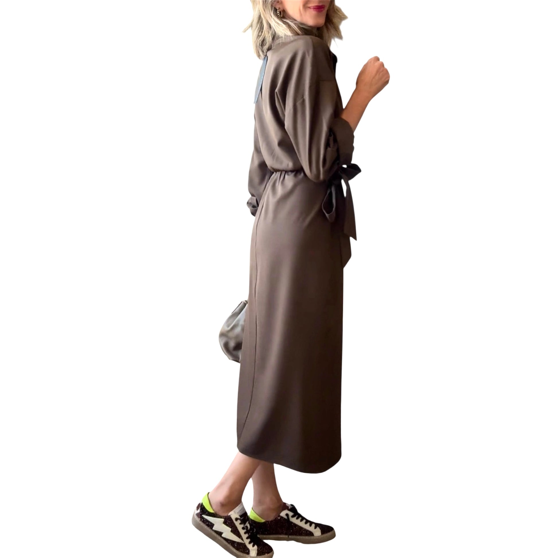 Vestido en color marrón .Manga larga.Cierre con cremallera a un lado.Lazada a un lado para poder ajustar.Botones en la parte de arriba.